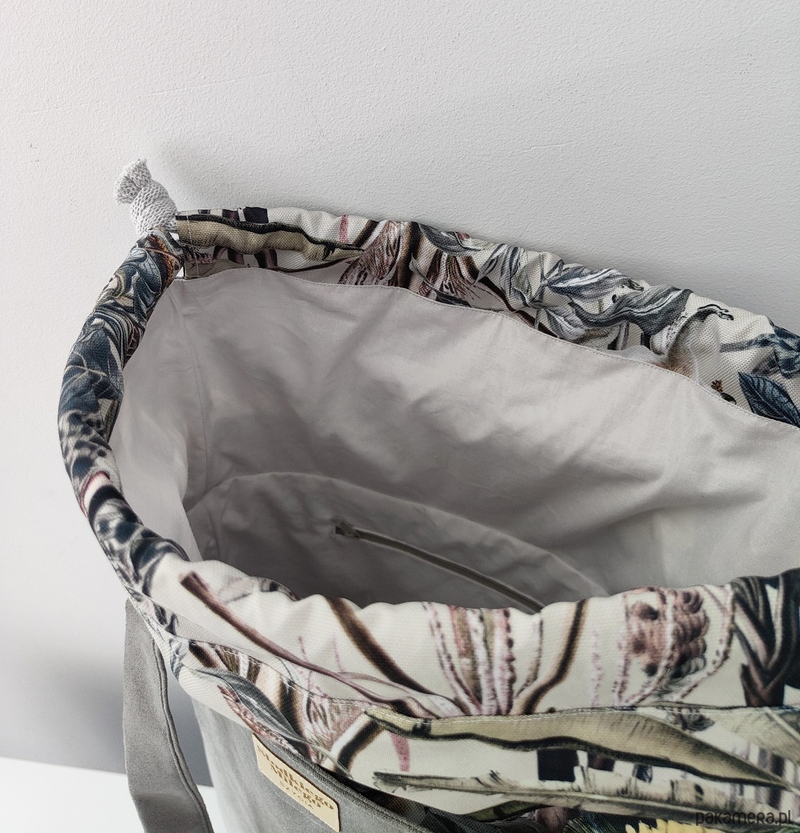 Wewnątrz bawełniana podszewka oraz Kieszonka zapinana na ekspres umieszczona na tylnej ścianie.