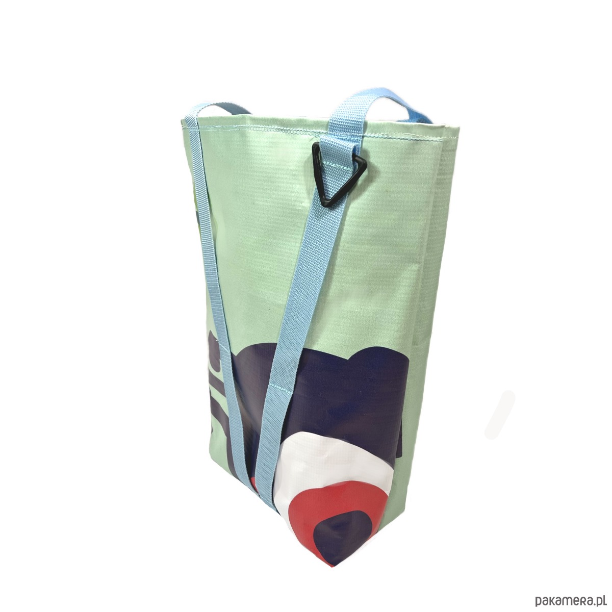 Duża torba typu hobo z bardzo mocnego, nieprzemakalnego materiału, odpornego na rozdarcia. Wykonana z baneru wcześniej użytego jako informacja o wystawie sztuki. Pojedynczy egzemplarz. Wewnątrz torby podszewka z wytrzymałego i nieprzemakalnego materiału Oxford.