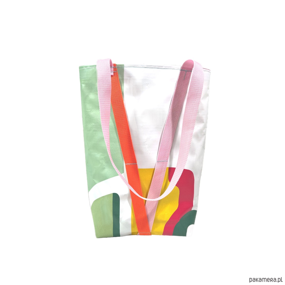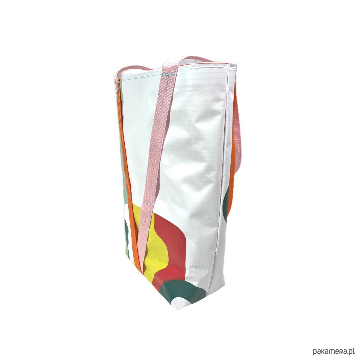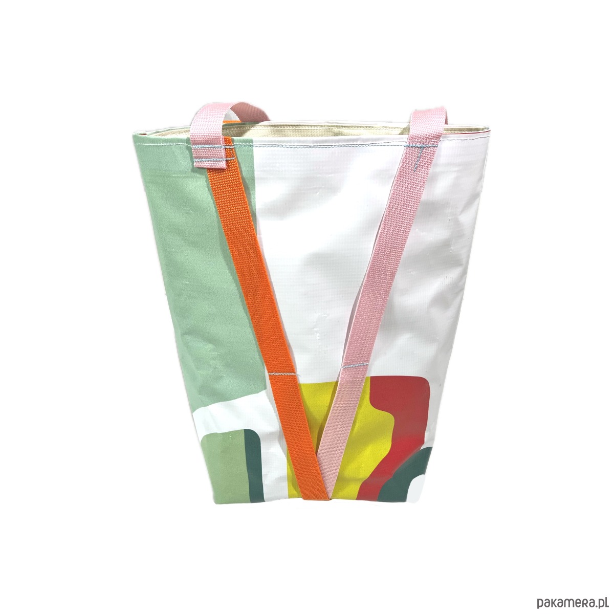 Duża torba typu hobo z bardzo mocnego, nieprzemakalnego materiału, odpornego na rozdarcia. Wykonana z baneru wcześniej użytego jako informacja o wystawie sztuki. Pojedynczy egzemplarz. Wewnątrz torby podszewka z wytrzymałego i nieprzemakalnego materiału Oxford.