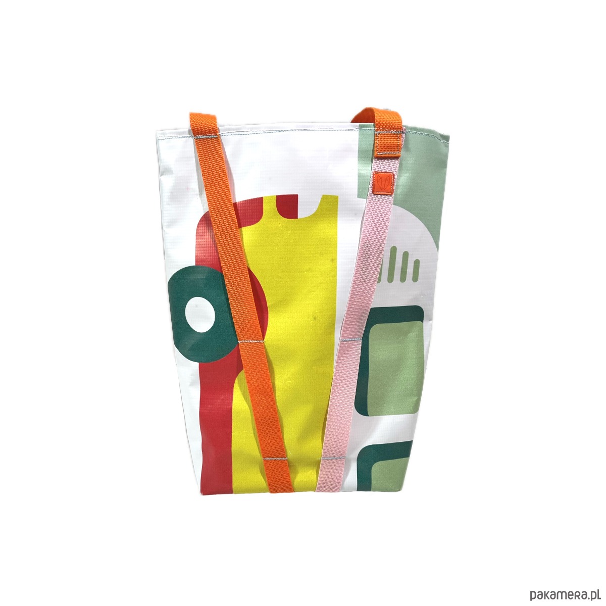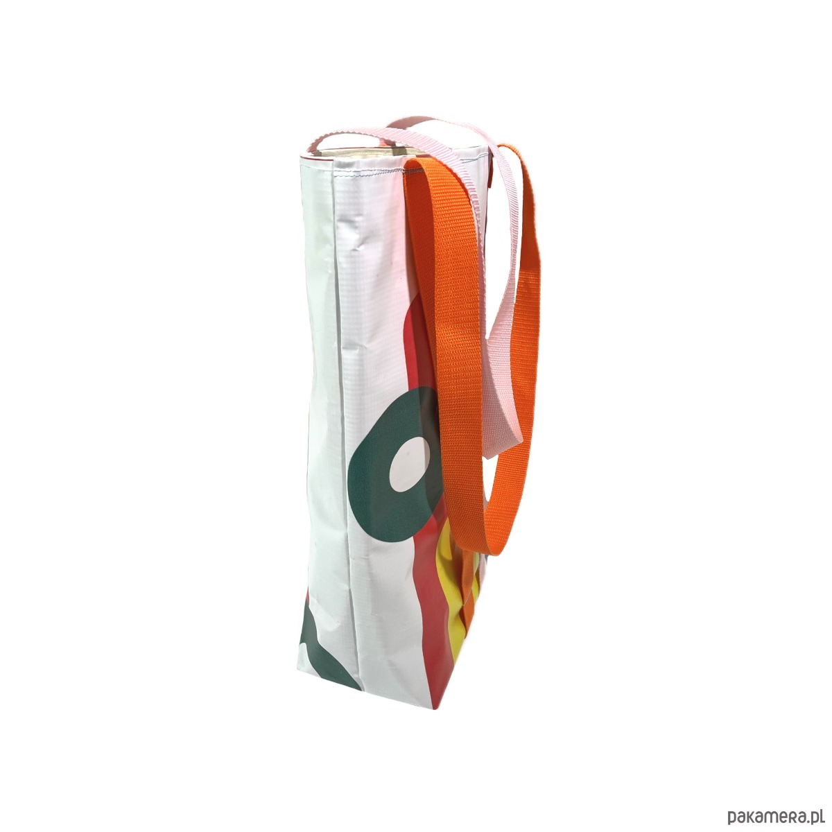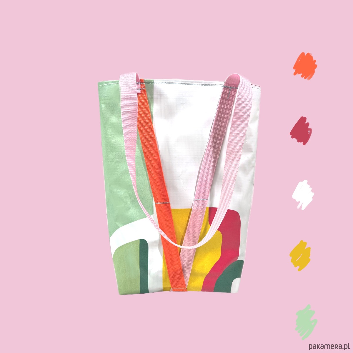 Duża torba typu hobo z bardzo mocnego, nieprzemakalnego materiału, odpornego na rozdarcia. Wykonana z baneru wcześniej użytego jako informacja o wystawie sztuki. Pojedynczy egzemplarz. Wewnątrz torby podszewka z wytrzymałego i nieprzemakalnego materiału Oxford.
