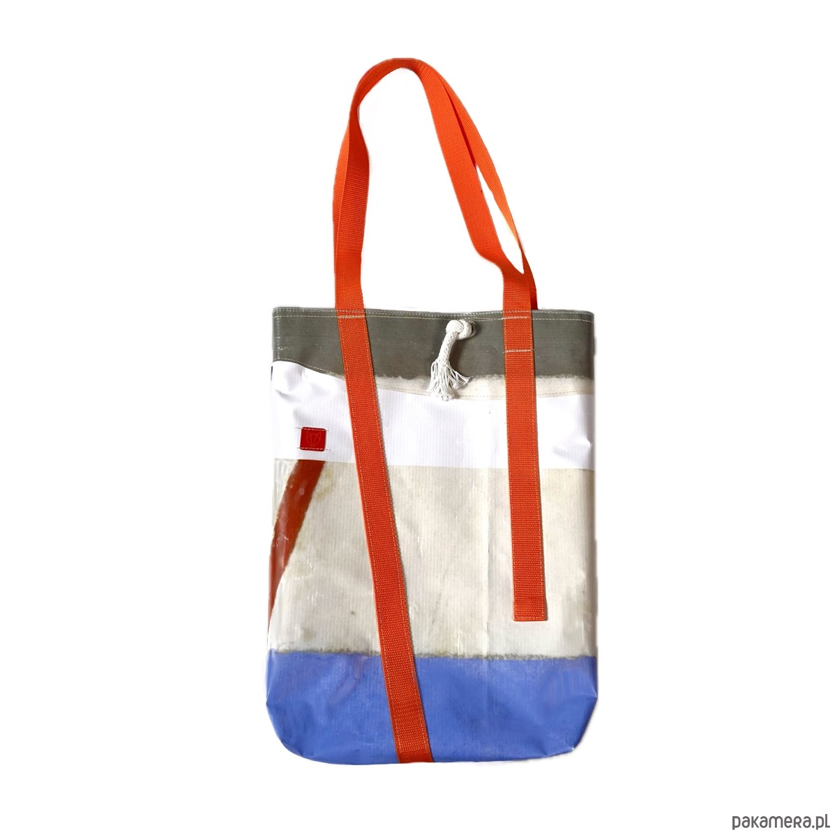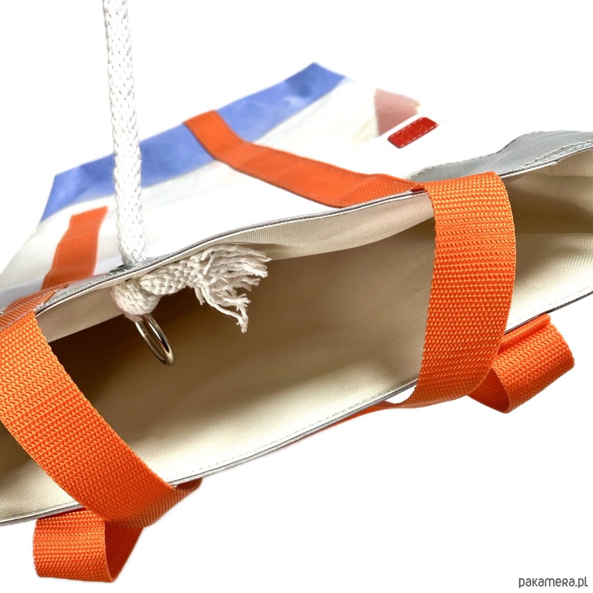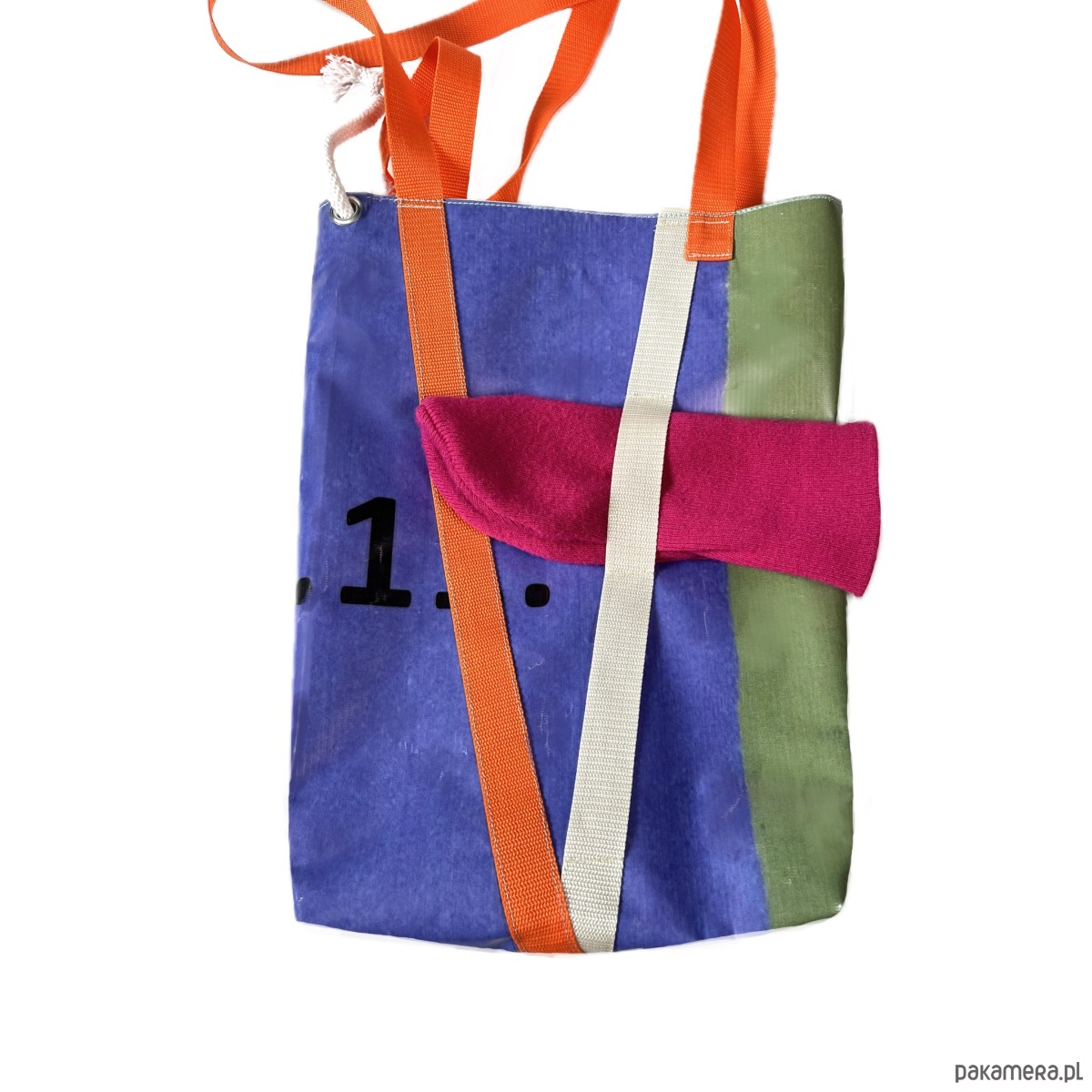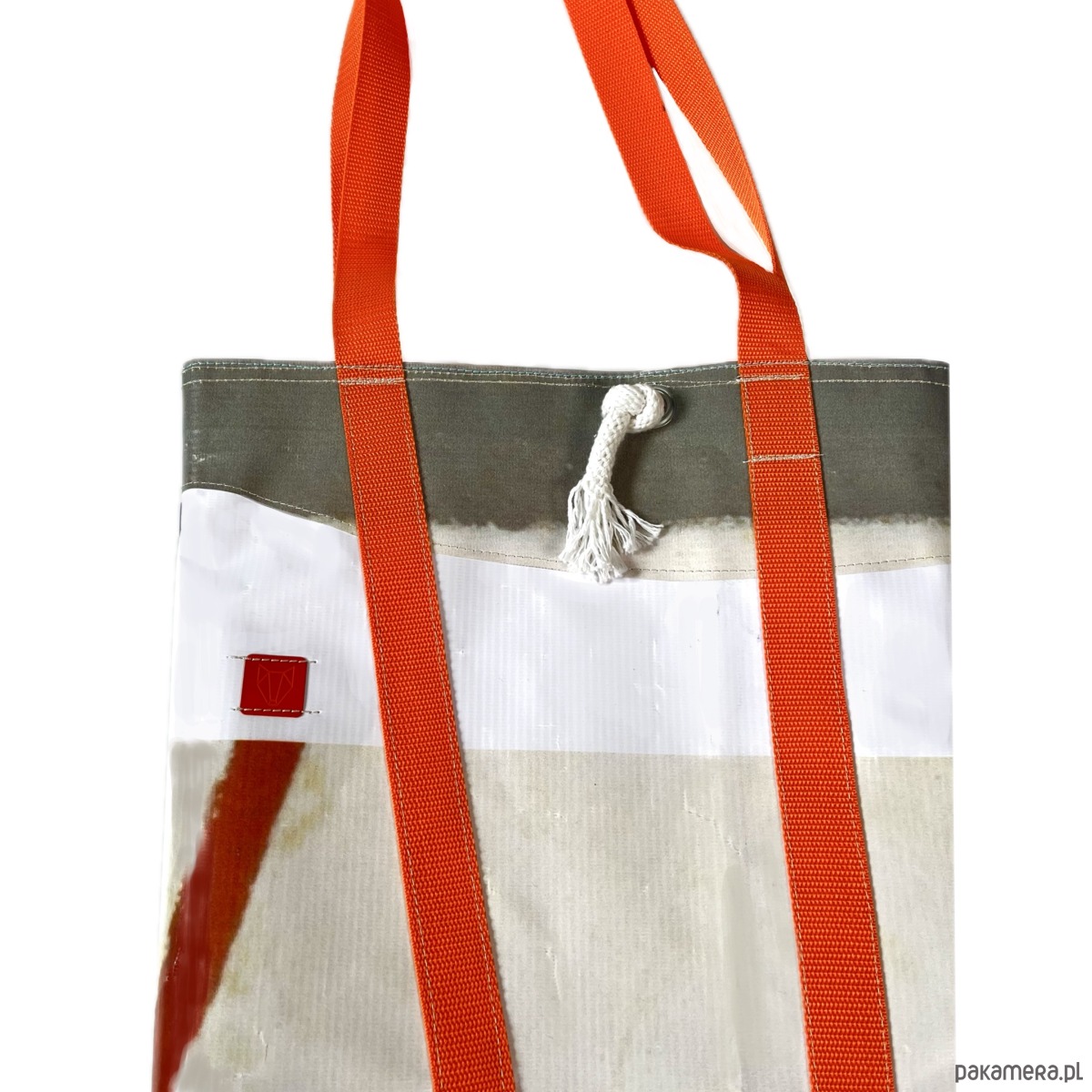 Duża torba typu hobo z bardzo mocnego, nieprzemakalnego materiału, odpornego na rozdarcia. Wykonana z baneru wcześniej użytego jako informacja o wystawie sztuki. Pojedynczy egzemplarz. Wewnątrz torby podszewka z wytrzymałego i nieprzemakalnego materiału Oxford.