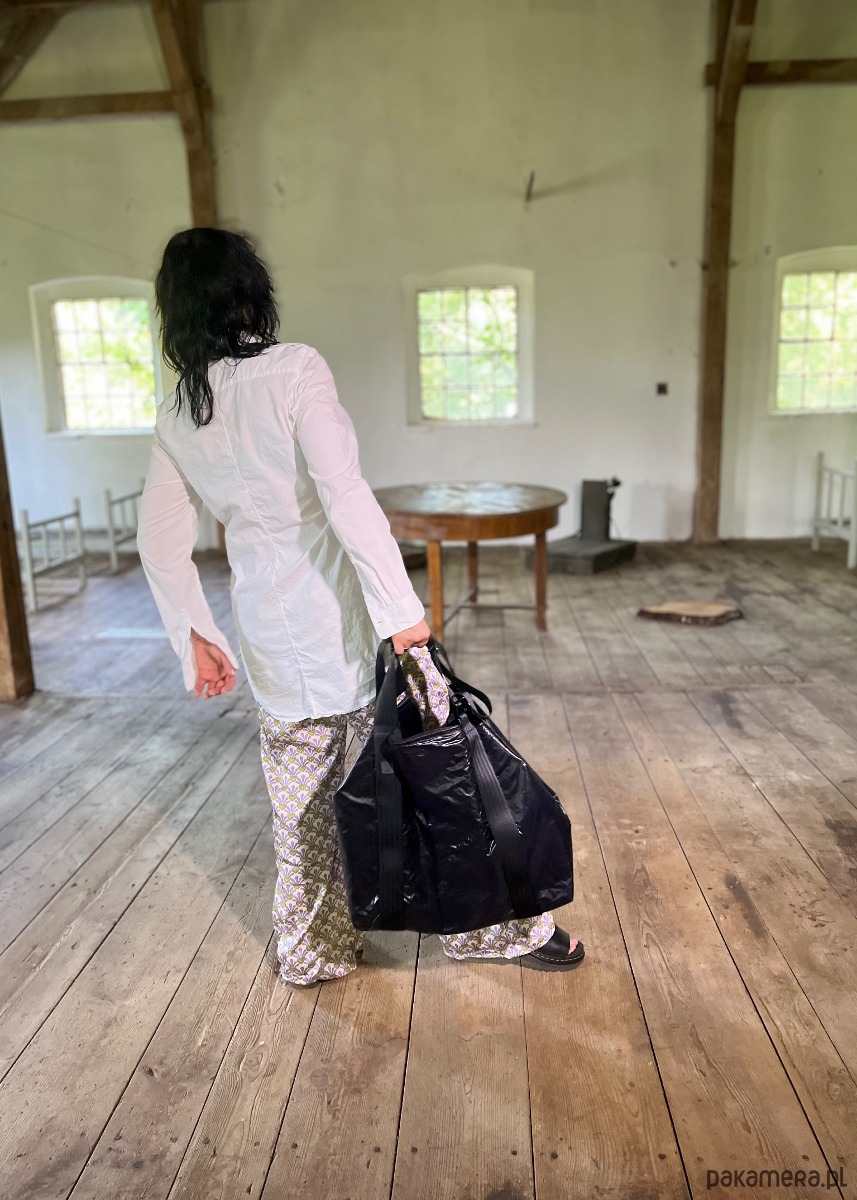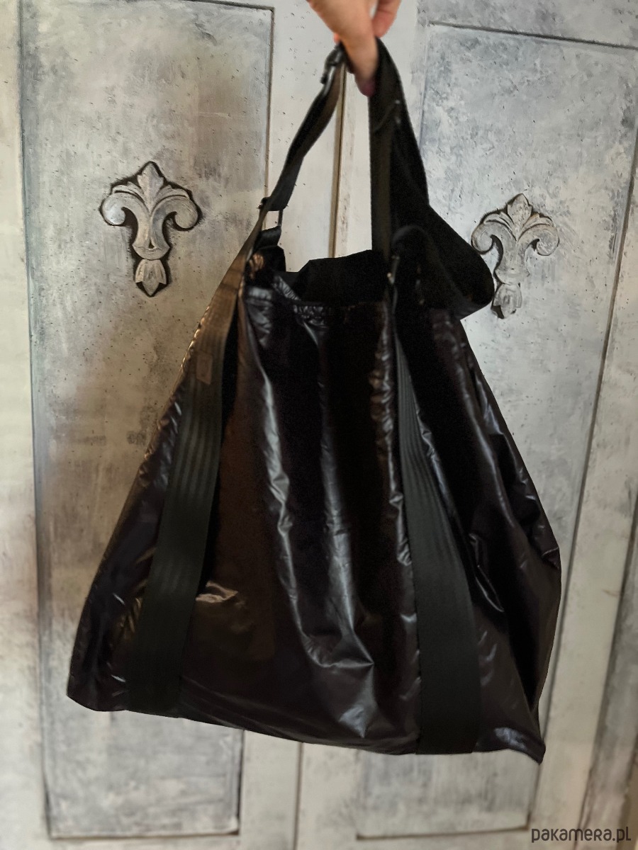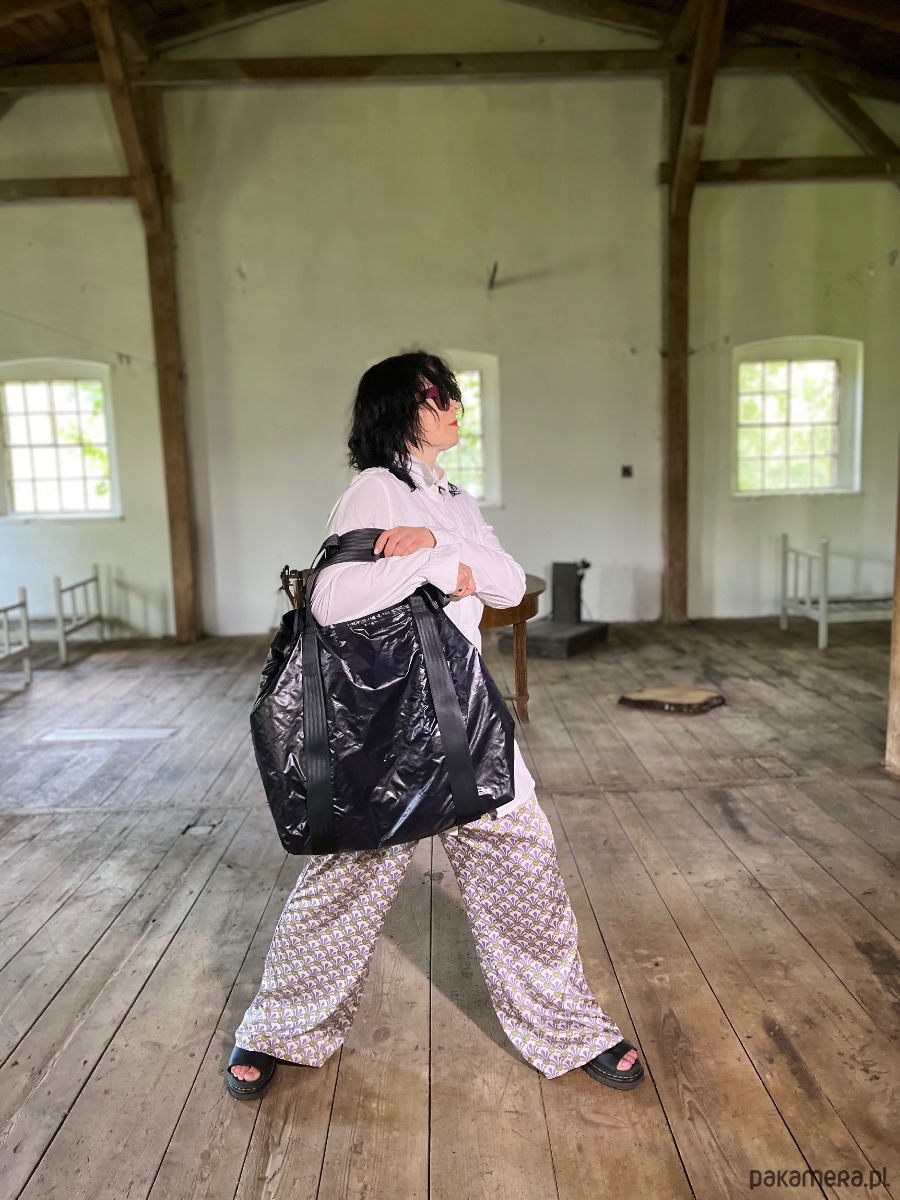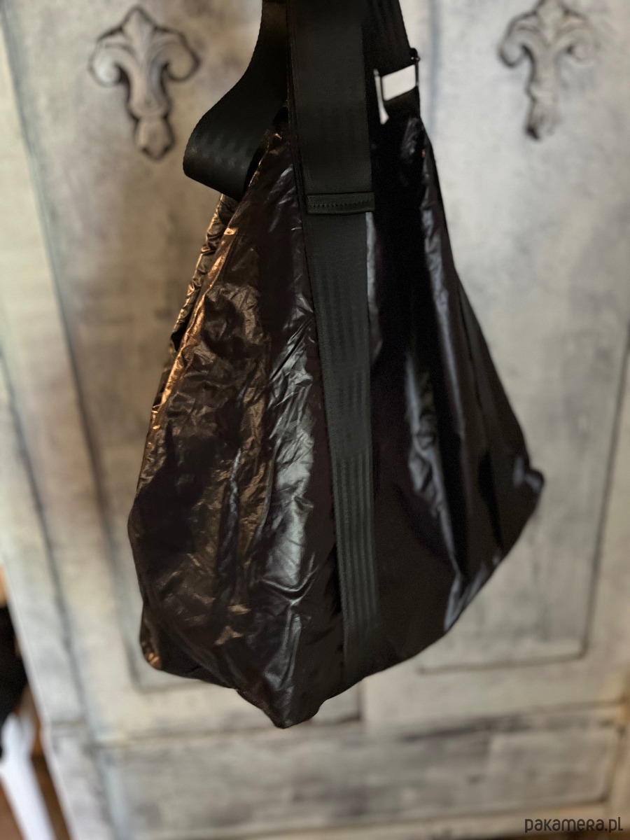 Duża torba typu hobo z bardzo mocnego, nieprzemakalnego materiału, odpornego na rozdarcia. Regulowane uchwyty są wykonane z pasów samochodowych, a zewnętrzna strona jest obszyta wysokiej jakości czarnym ortalionem. Największa w mojej kolekcji. To dodatek na co dzień i na okazje specjalne. Wewnątrz znajduje się kieszeń na portfel, telefon i inne rzeczy.