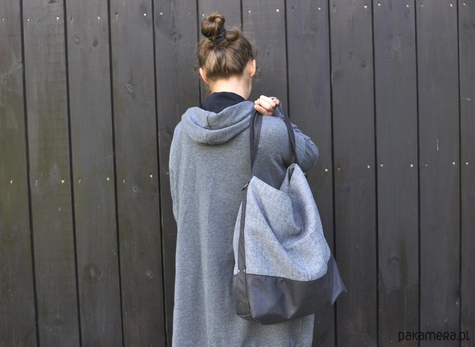 Duża torba wykonana solidnej, grubo tkanej, płóciennej tkaniny i eko zamszu.