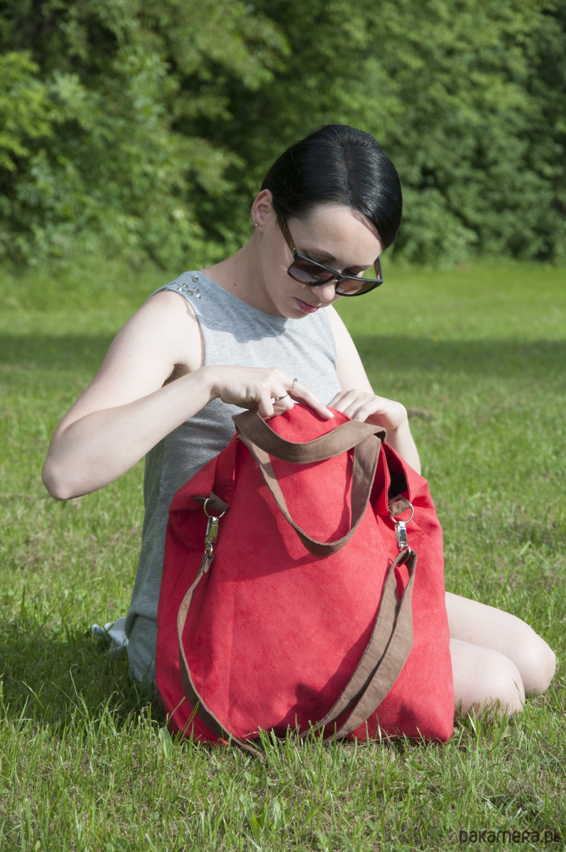 Przepastna torba wykonana z alcantry (syntetycznego zamszu).