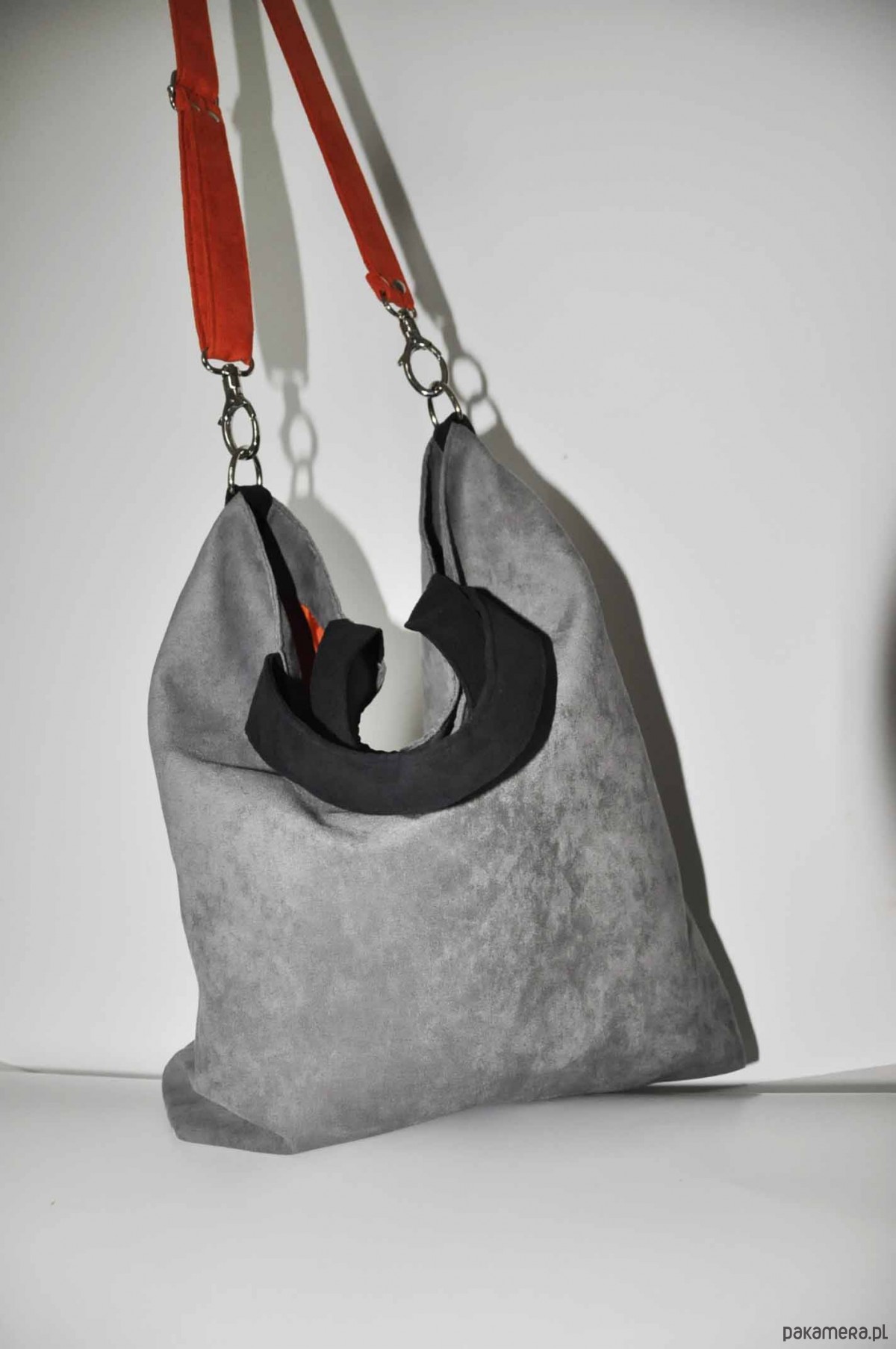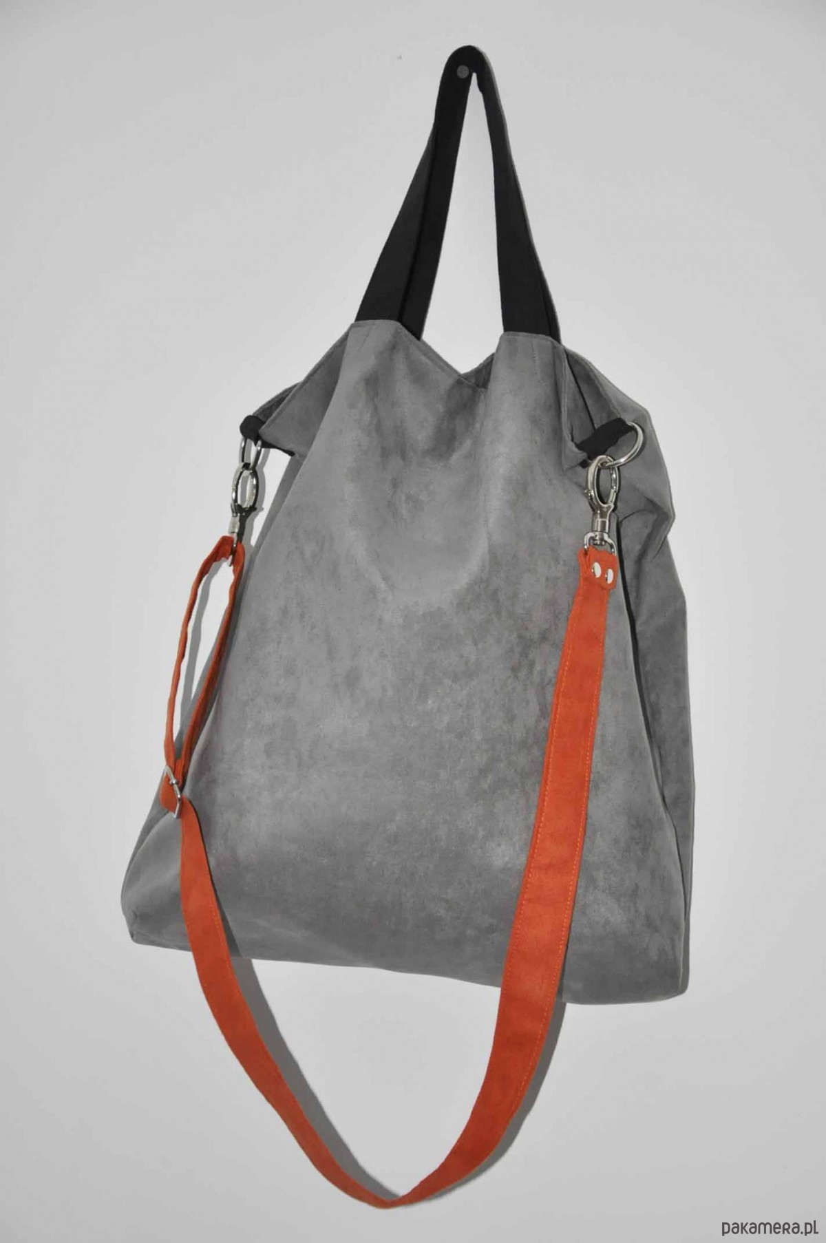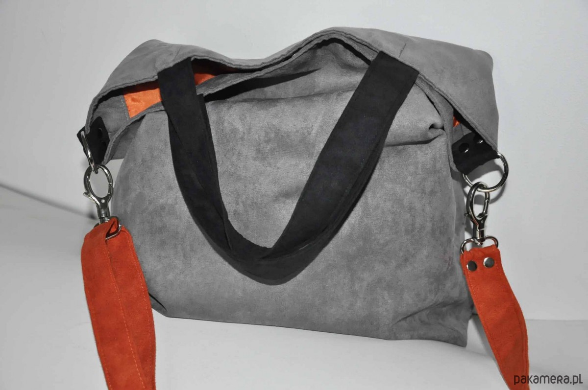 Przepastna torba wykonana z alcantry (syntetycznego zamszu).