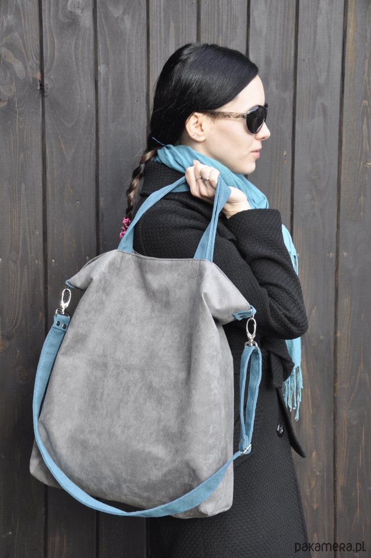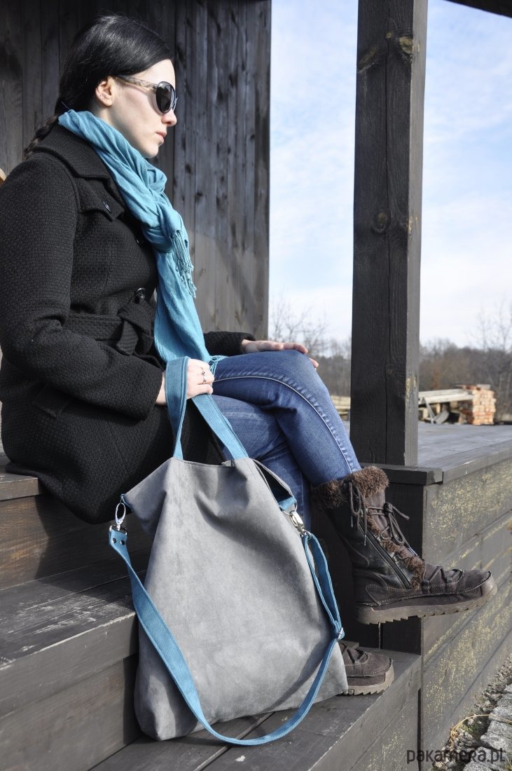 Przepastna torba wykonana z alcantary (syntetycznego zamszu). Mieści format A4 i więcej... Zapinana na magnes. W środku wykończona szmaragdową podszewką, z dwudzielną kieszonką. Możliwość noszenia na dwa sposoby-pasek dopinany na karabińczyki, regulowany w zakresie 125cm- 70cm wykonany z alcantary, uszy także. Wymiary: szer. w najszerszym miejscu - 47cm szer. na dole - 35cm wys. - 42cm głębokość - ok 12cm długość ucha - 40cm