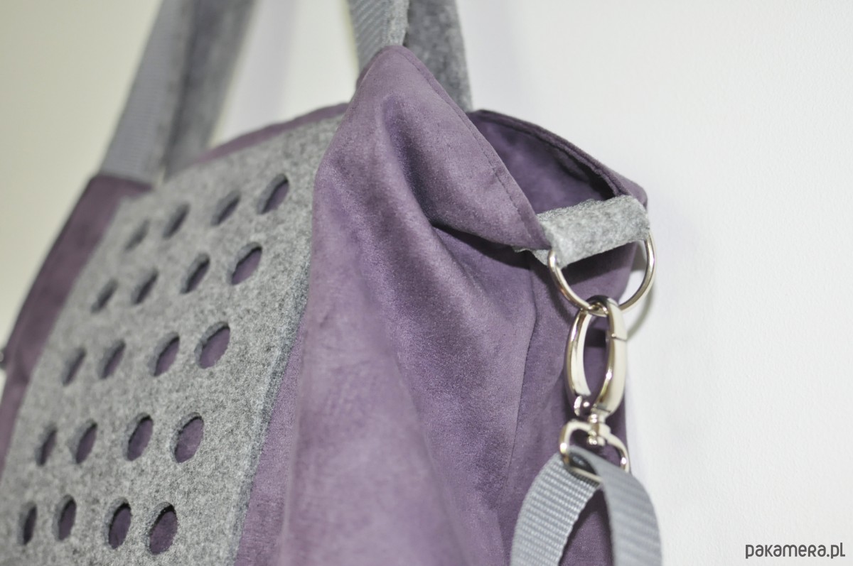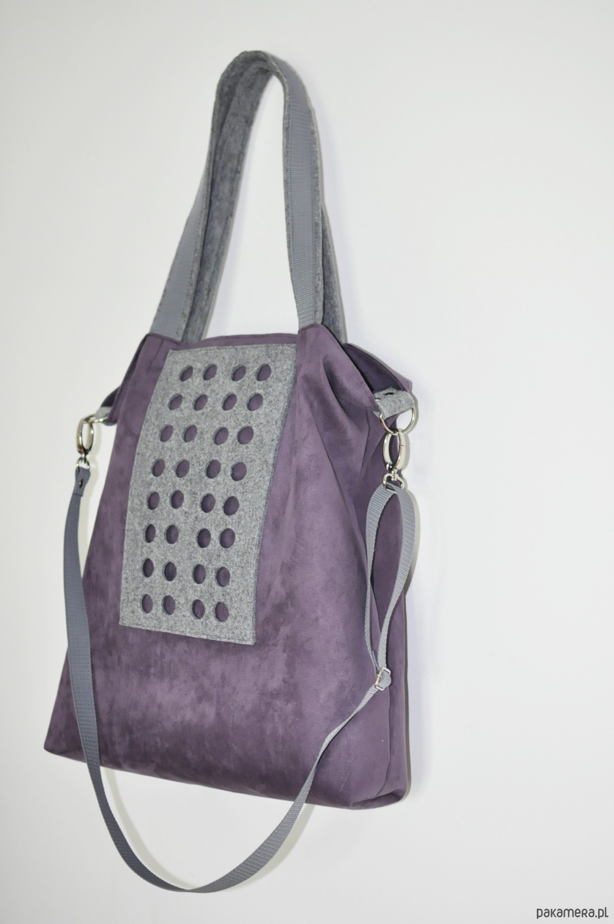 Przepastna torba wykonana z weluru w połączeniu z filcem. Mieści format A4 i więcej... Zapinana na magnes. W środku wykończona podszewką, z dwudzielną kieszonką. Możliwość noszenia na dwa sposoby-pasek dopinany na karabińczyki, regulowany w zakresie 125cm- 70cm.