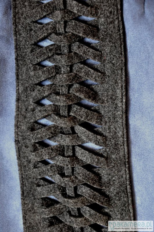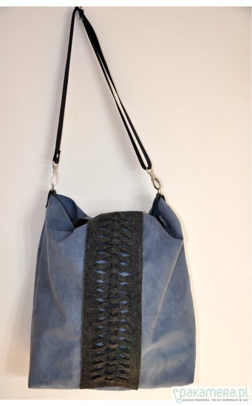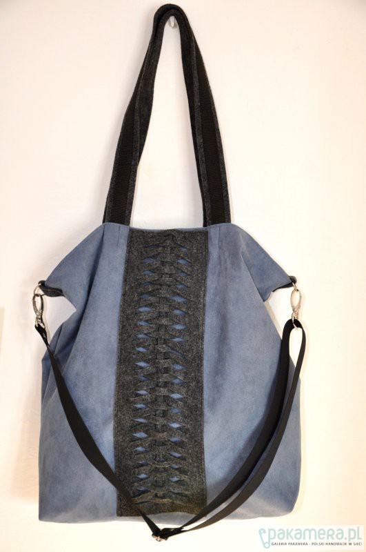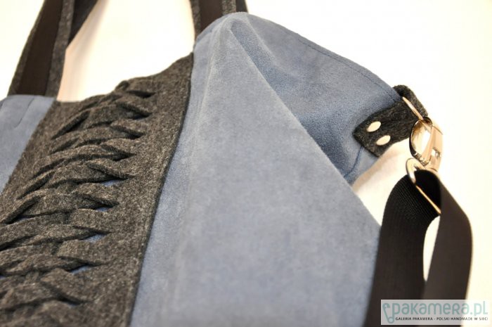 Przepastna torba wykonana z alcantary (sztucznego zamszu) w połączeniu z filcem (szaroniebieska + grafit).