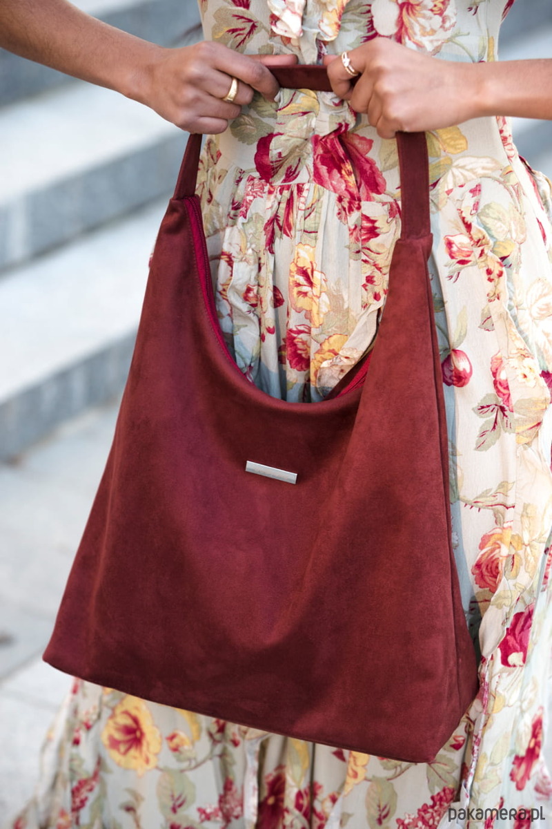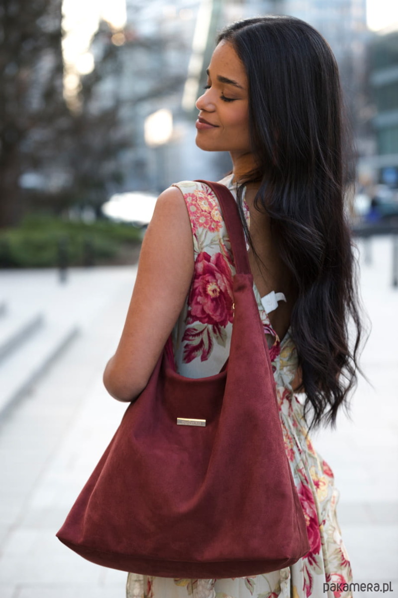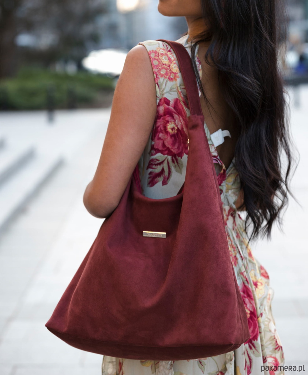 Torba HOBO do noszenia na ramieniu, z ekologicznego nubuku tapicerskiego w kolorze bordo.