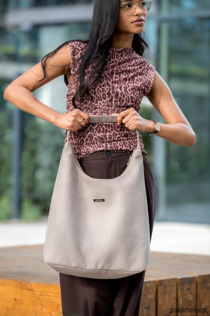 Torba HOBO z ciemno beżowego nubuku tapicerskiego.