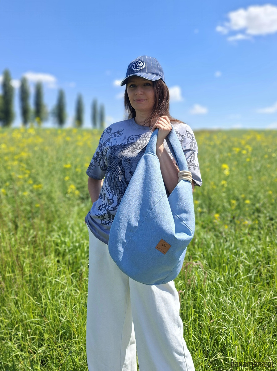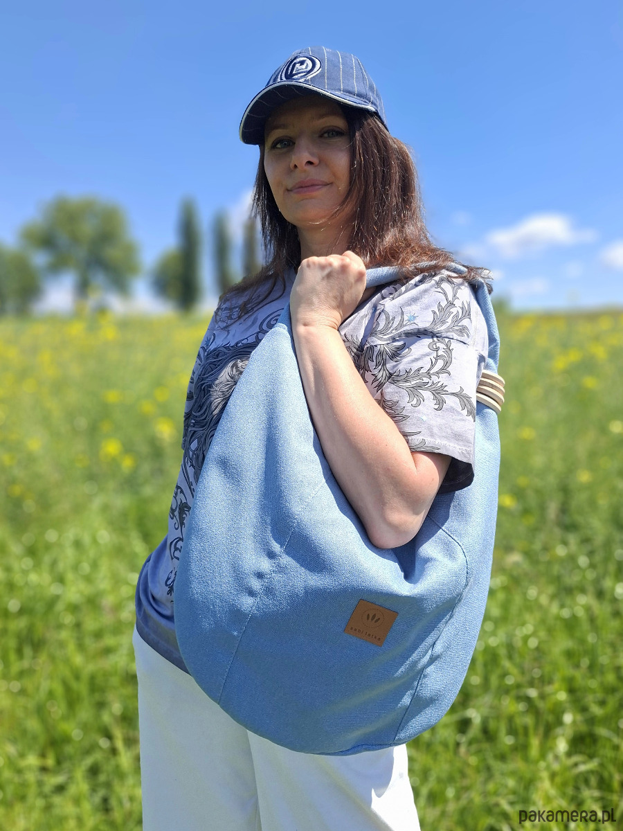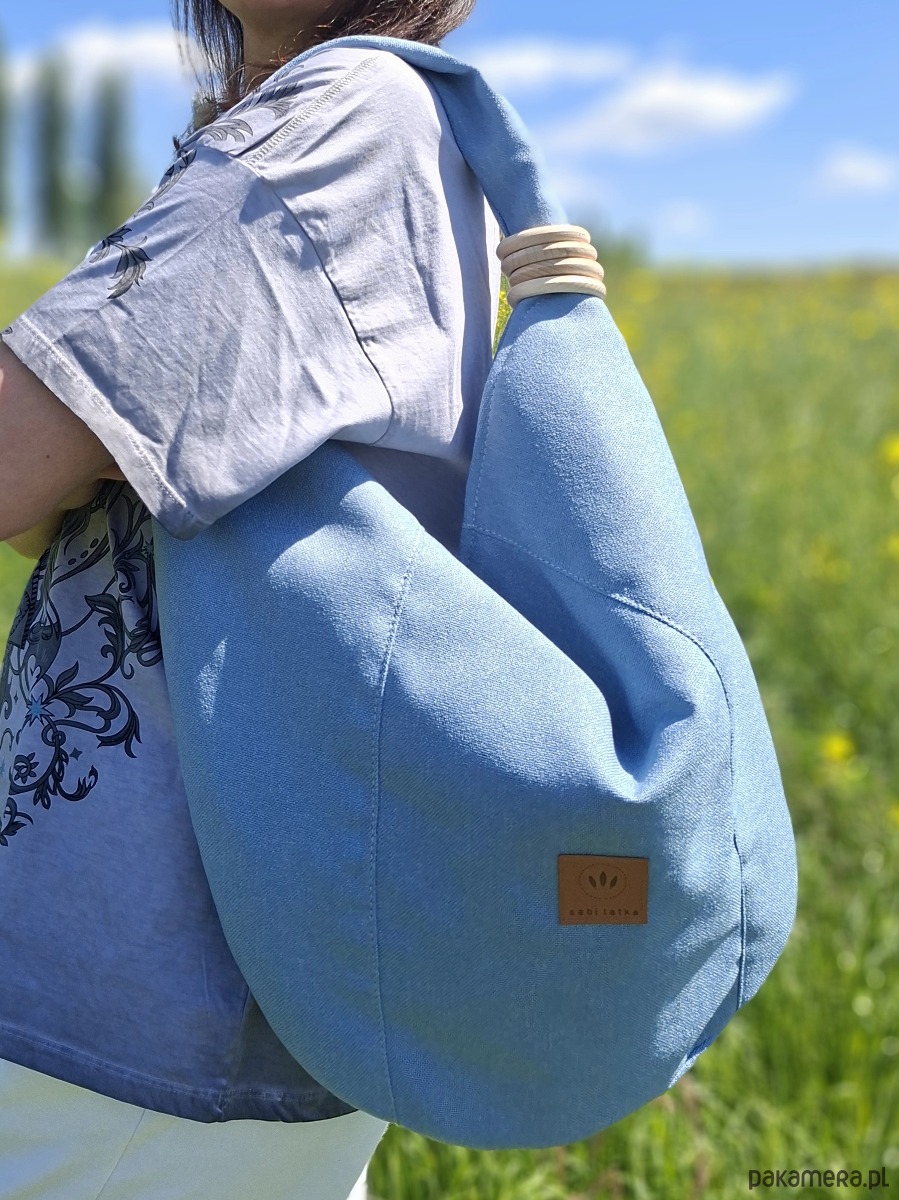 Duża torebka worek z plecionej tkaniny tapicerskiej przypominającej len.
