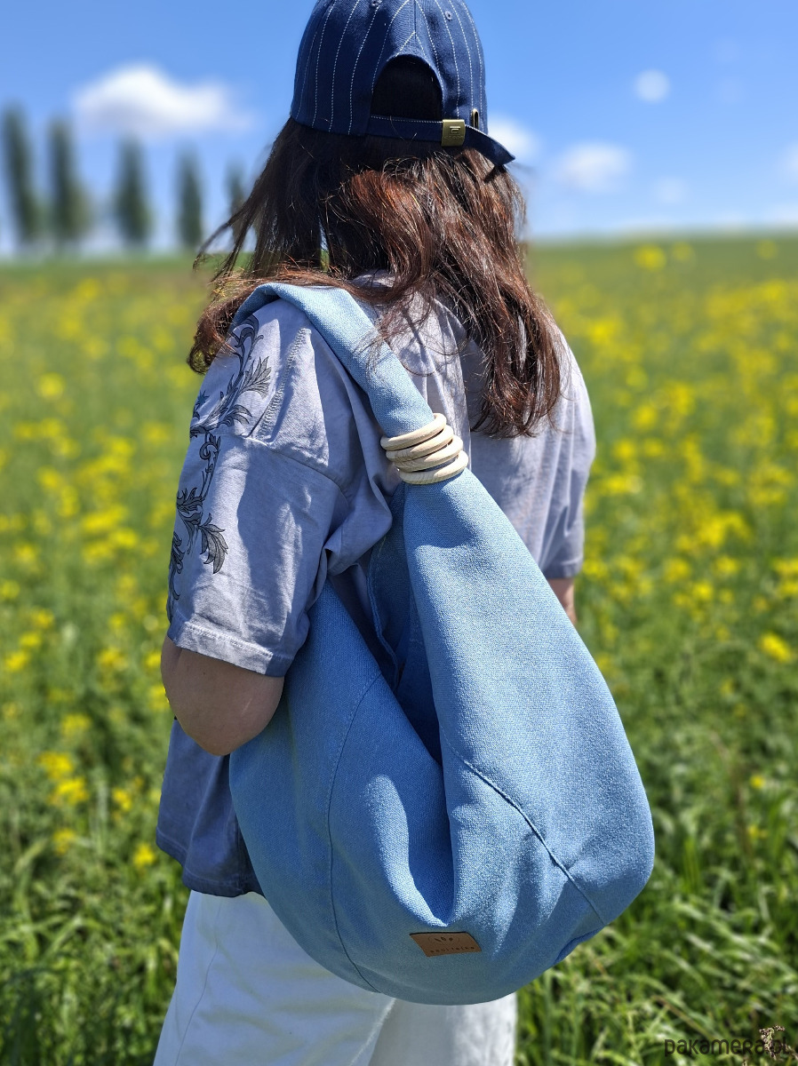 Pasek torebki jest szeroki, można go dowolnie formować np. składać na pół. W pasku ozdobne kółka drewniane.