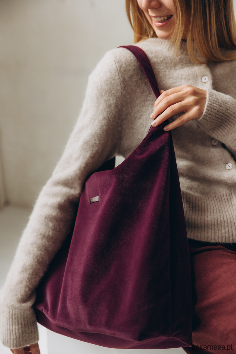Torba HOBO z weluru tapicerskiego w kolorze BAKŁAŻANOWYM