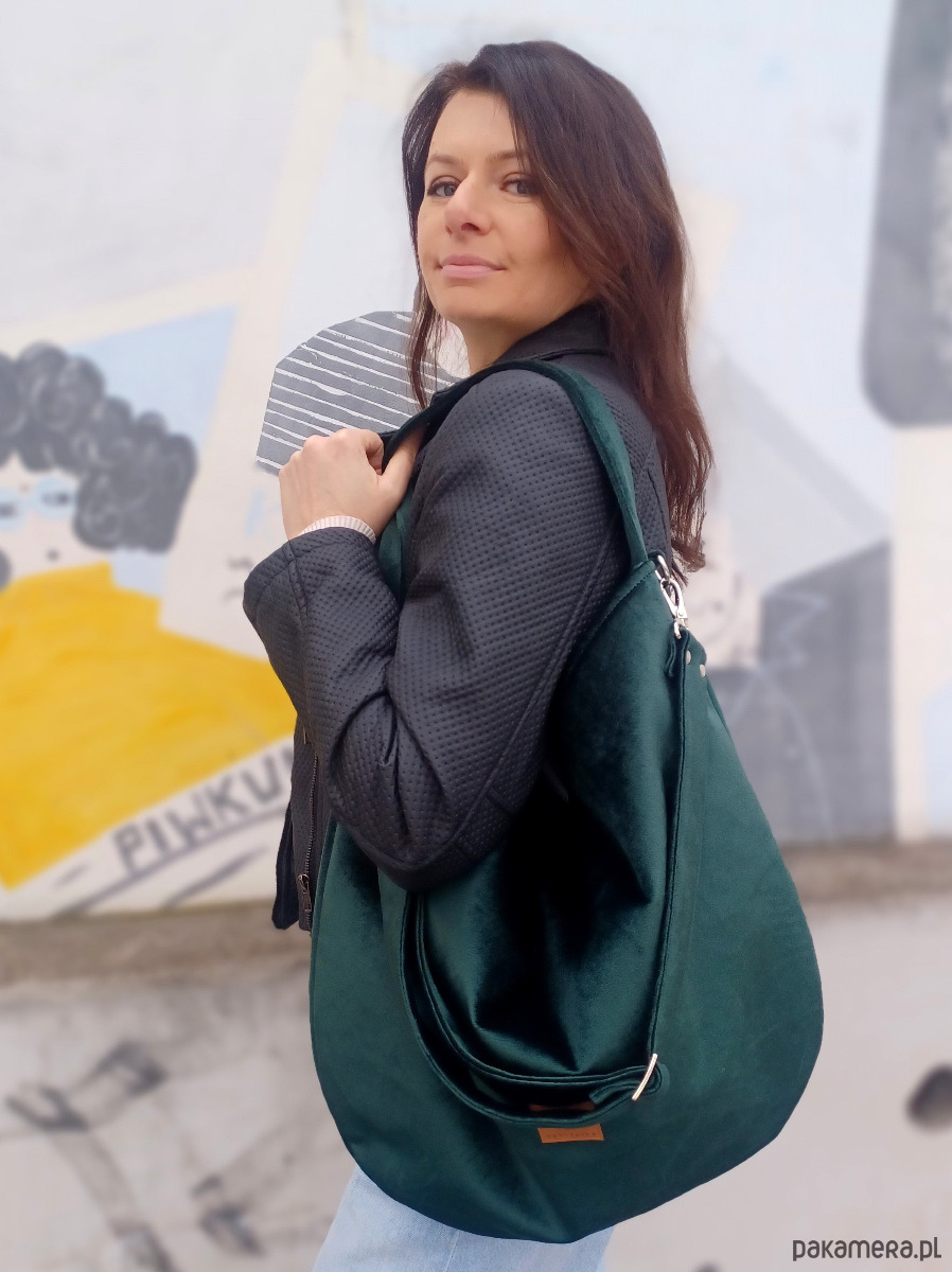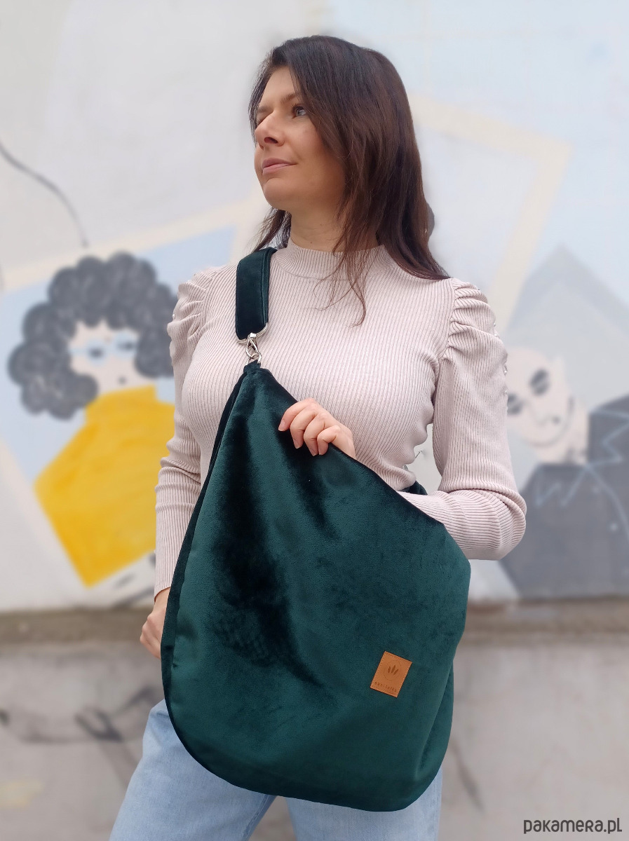 Miękka torebka worek w pięknym kolorze butelkowej zieleni z wodoodpornego weluru.