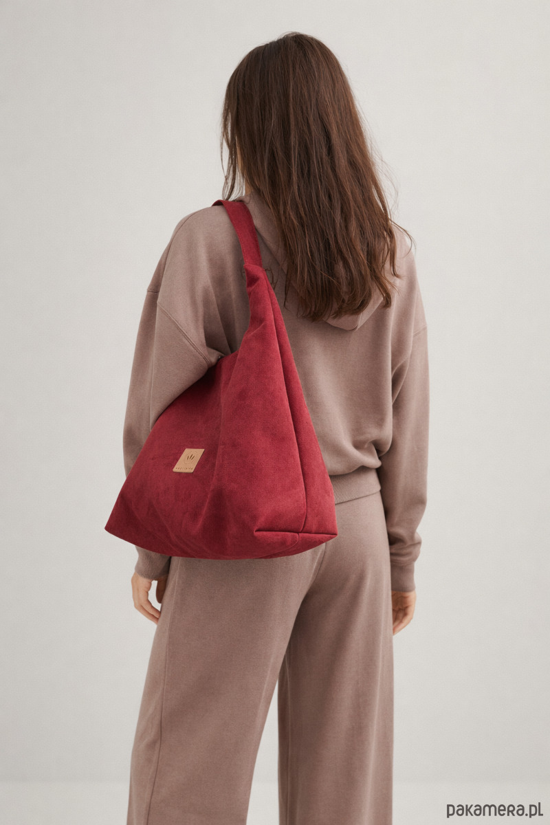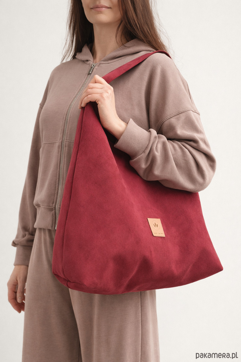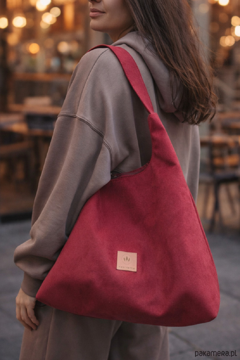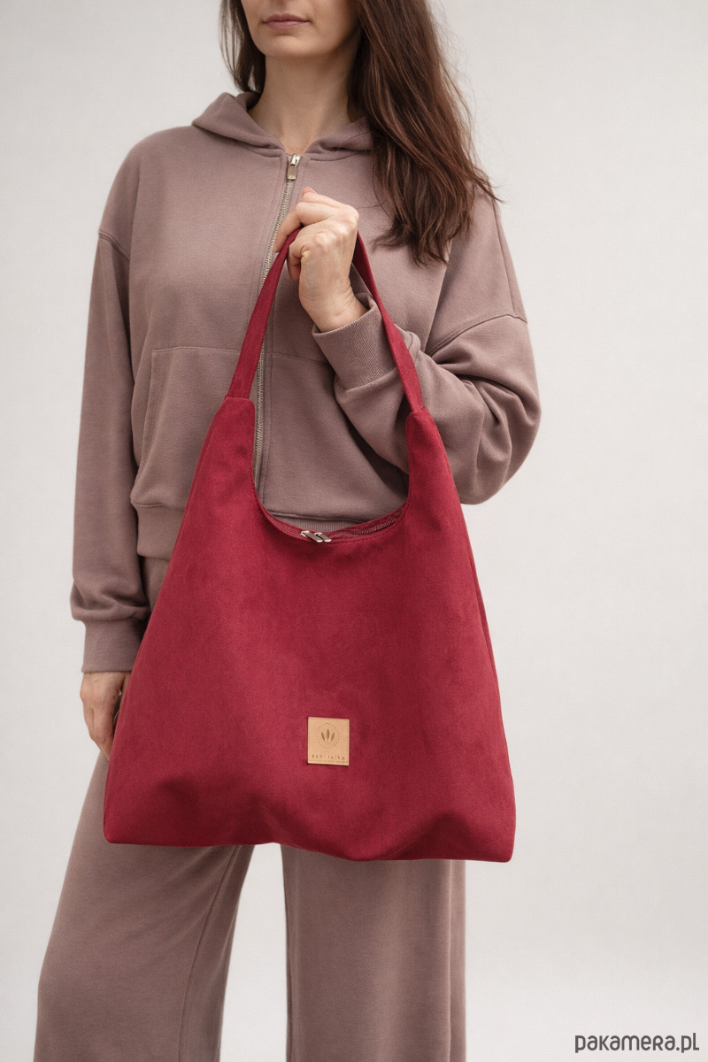 Elegancka torba typu hobo o zamszowej, przyjemnej w dotyku fakturze w kolorze zgaszonej czerwieni.