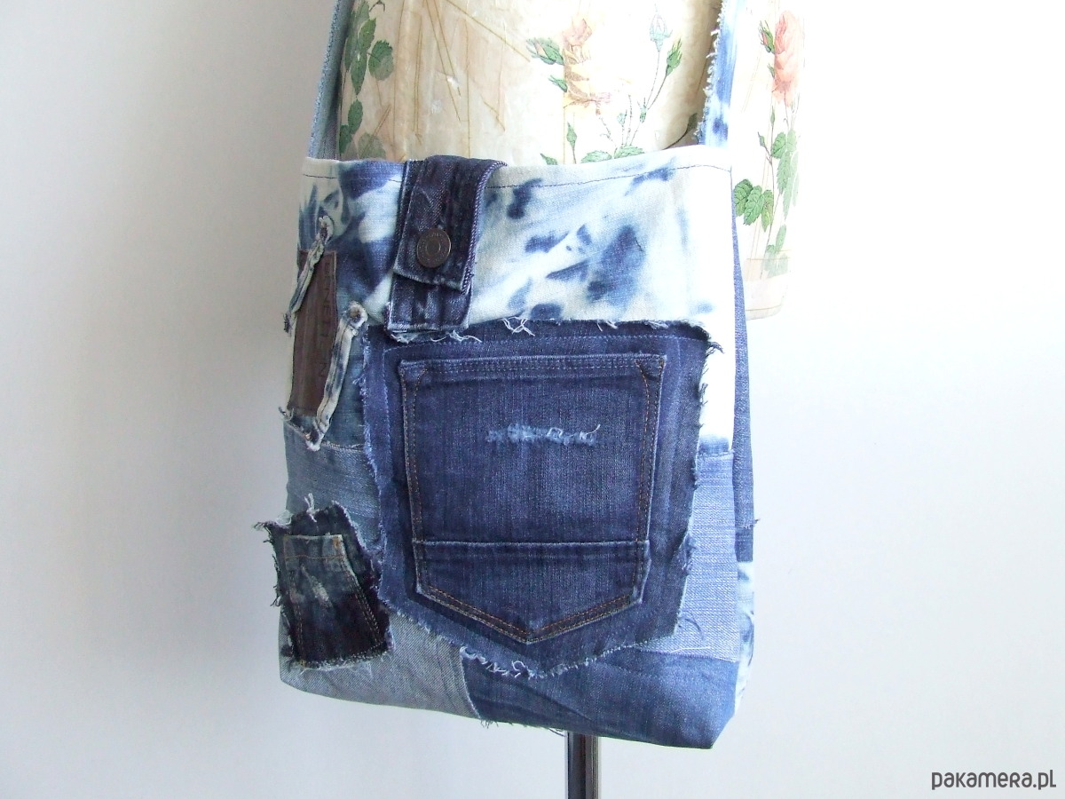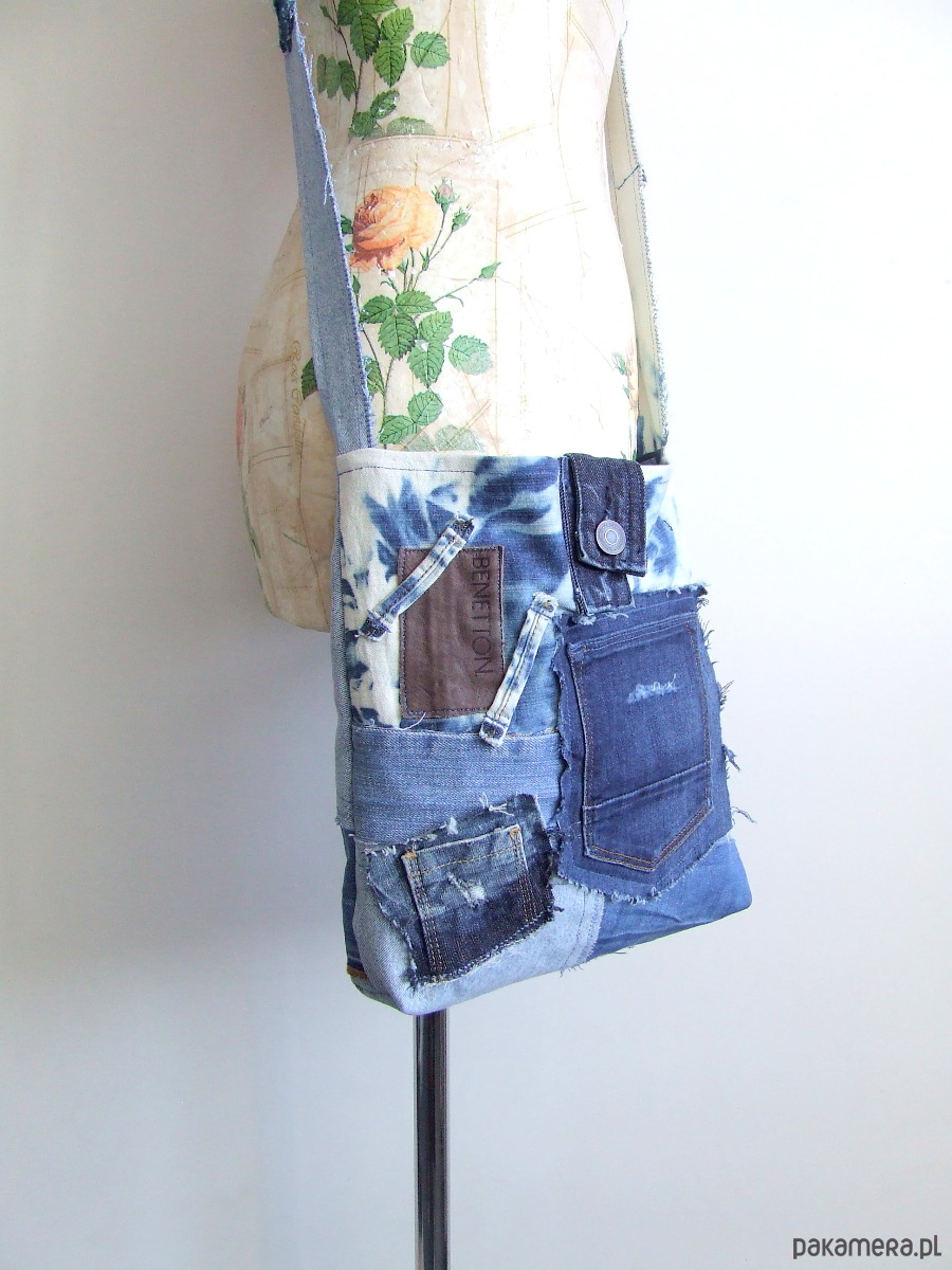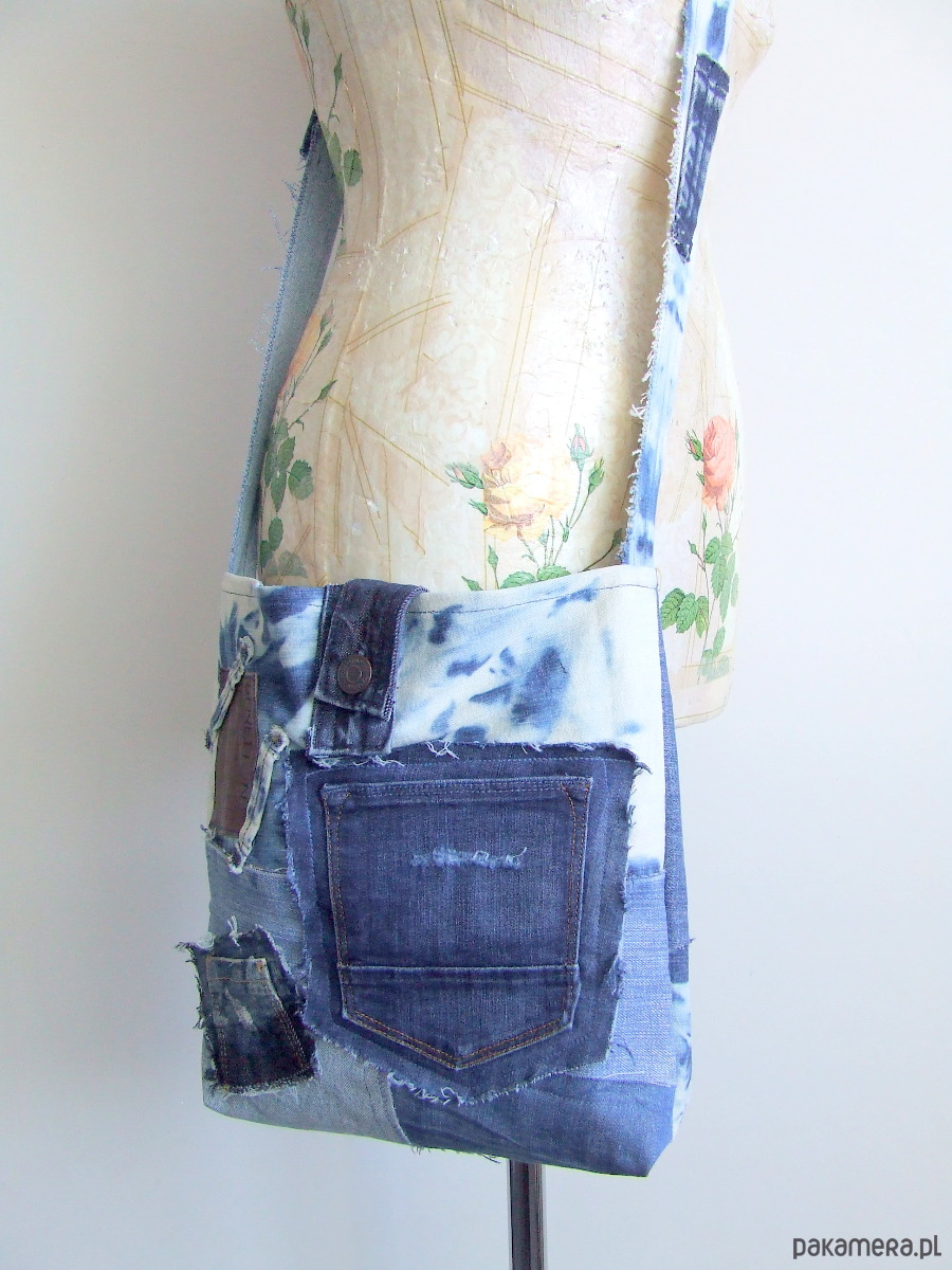 torba przez ramię uszyta z recyklingowanego denimu w różnych odcieniach