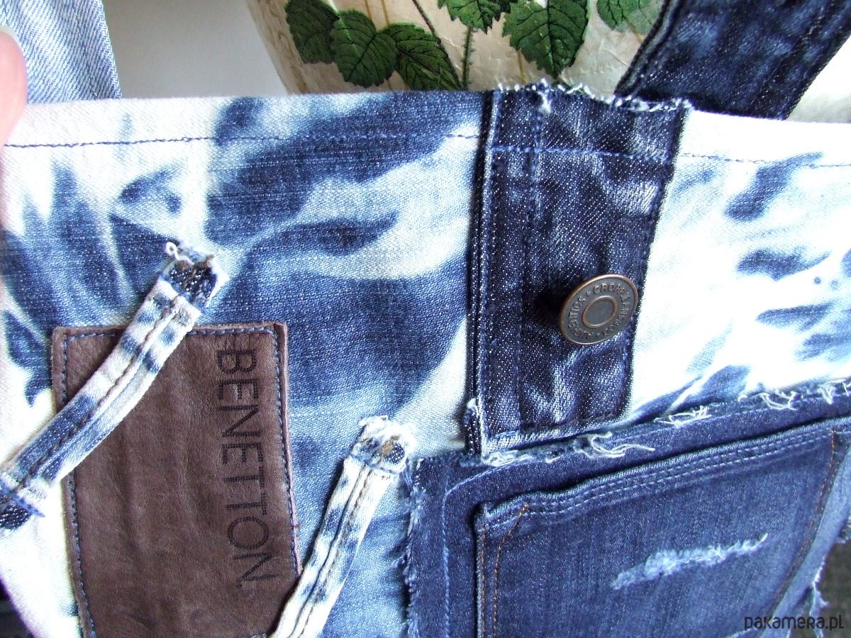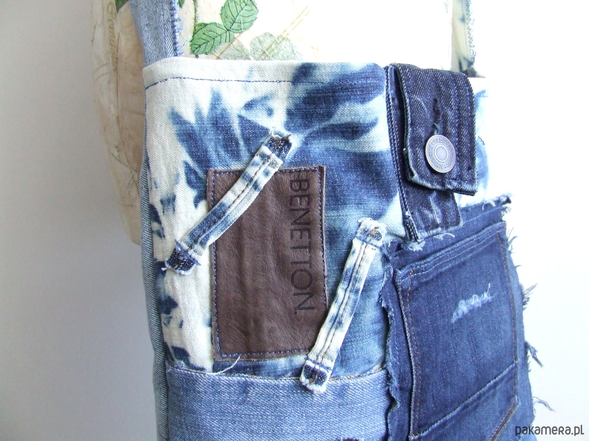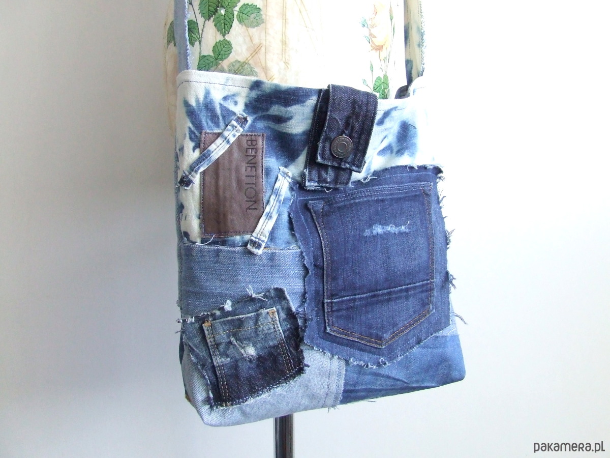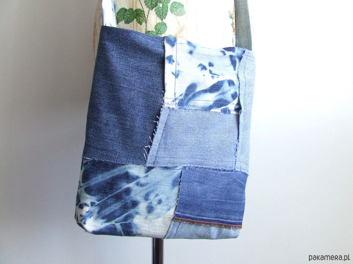 torba przez ramię uszyta z recyklingowanego denimu w różnych odcieniach