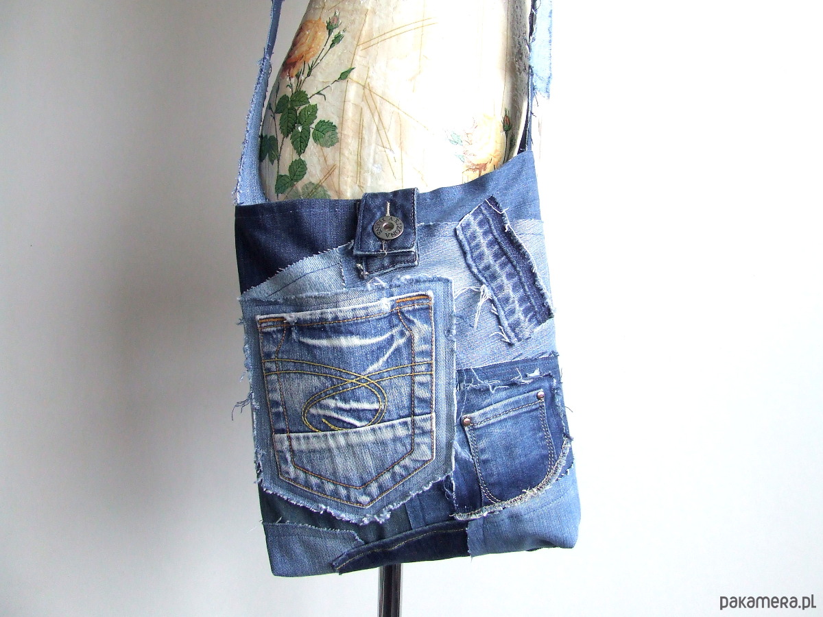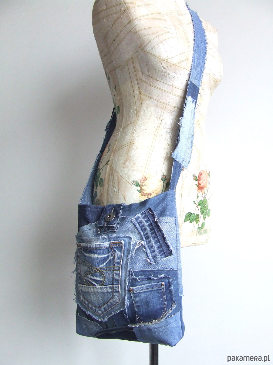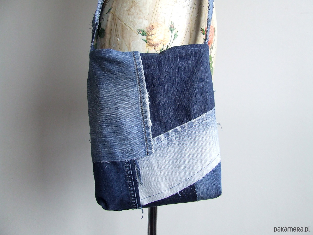 torba przez ramię uszyta z recyklingowanego denimu w różnych odcieniach