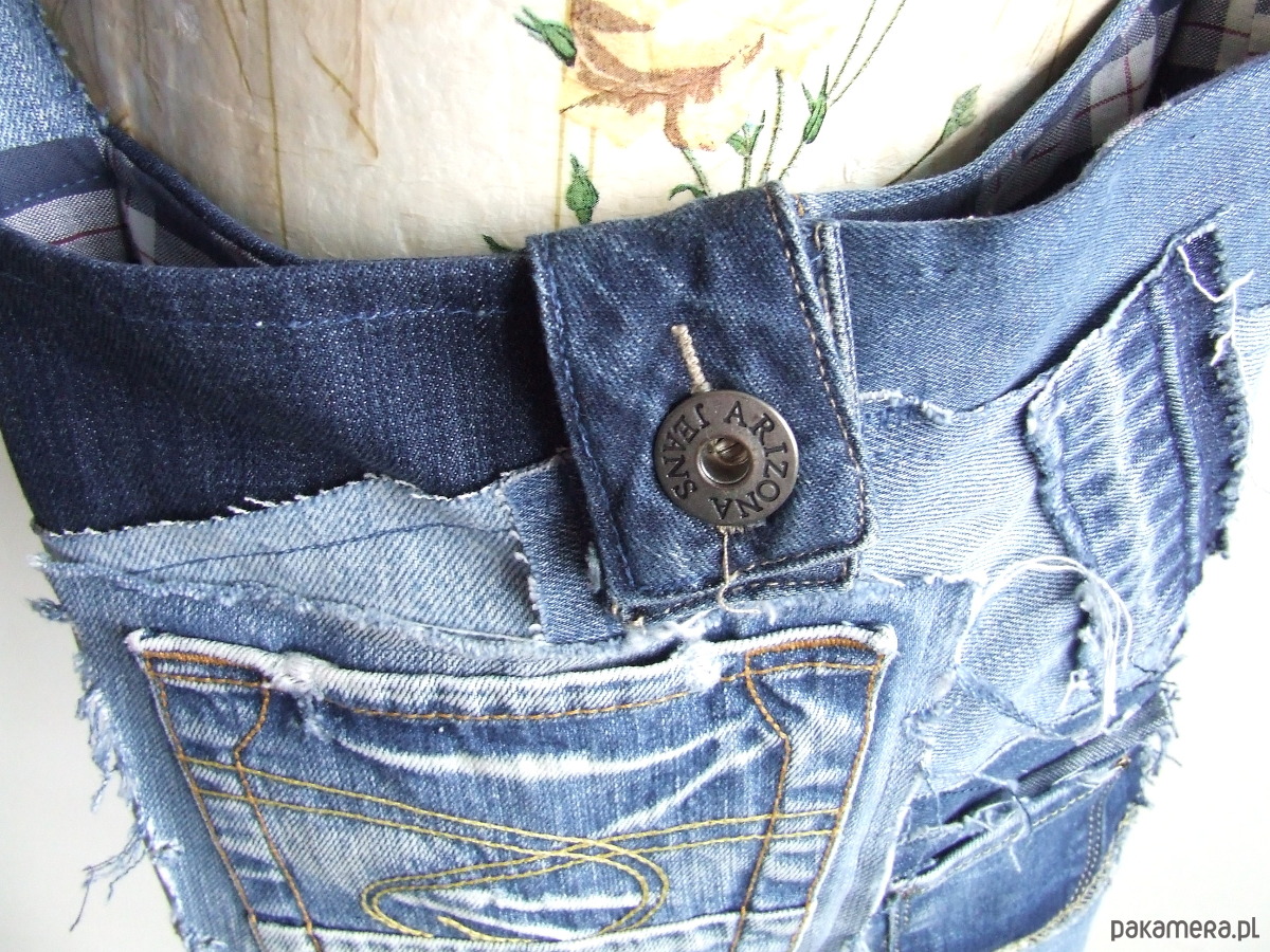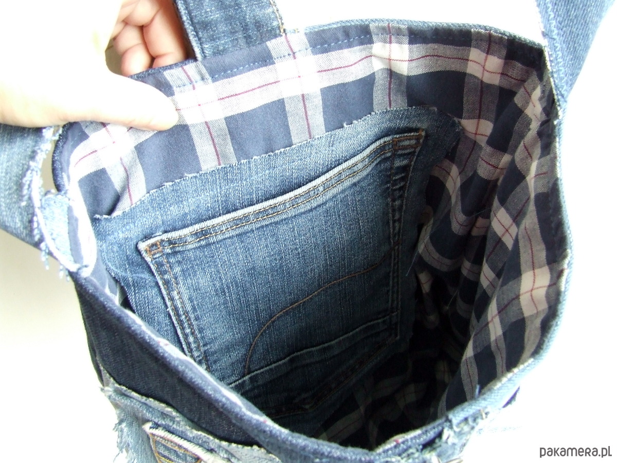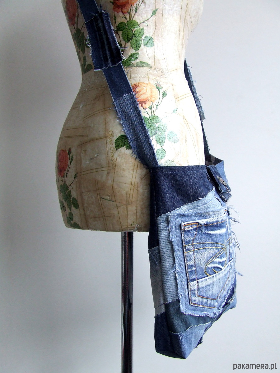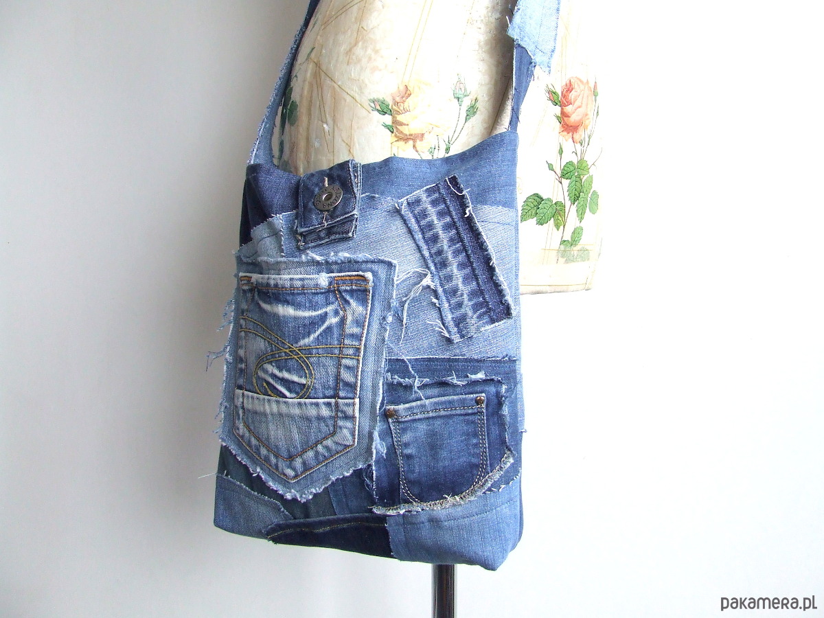 torba przez ramię uszyta z recyklingowanego denimu w różnych odcieniach
