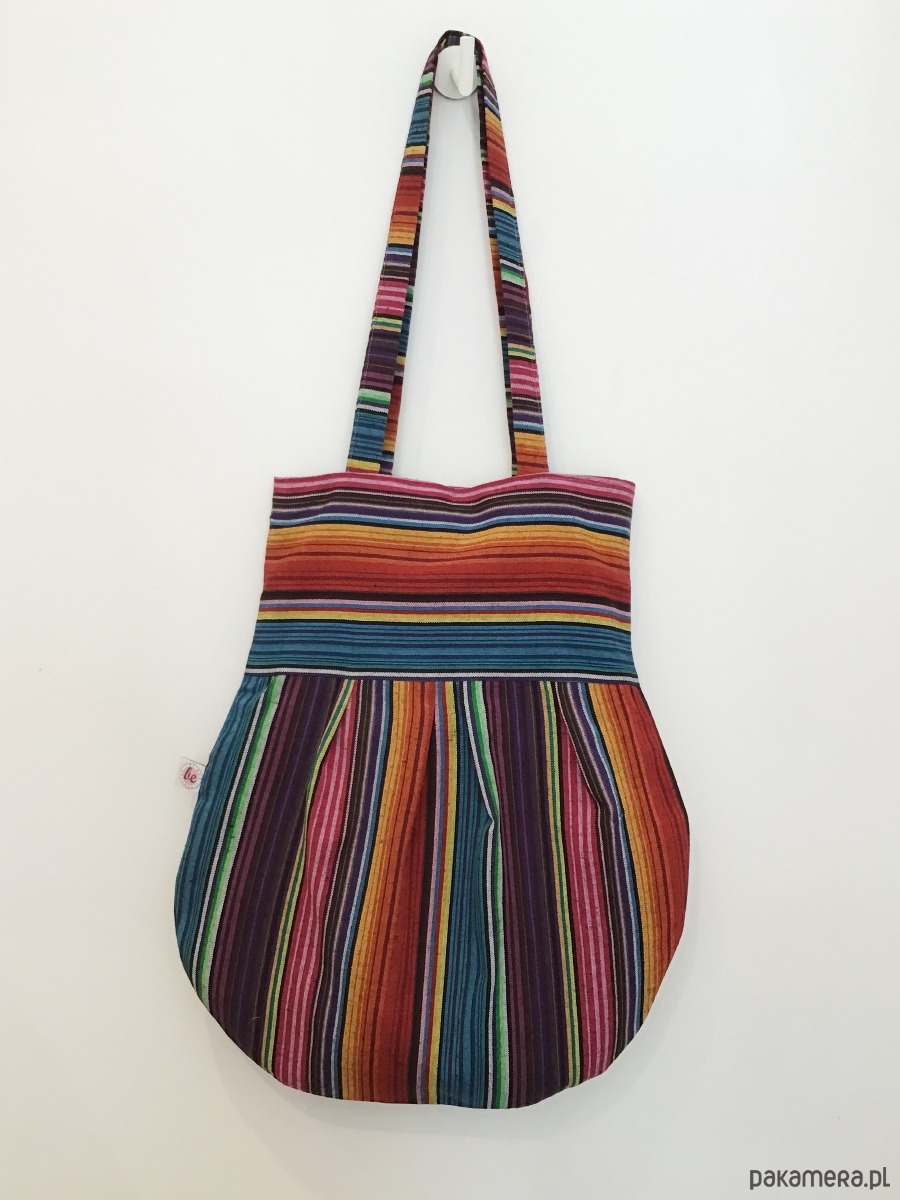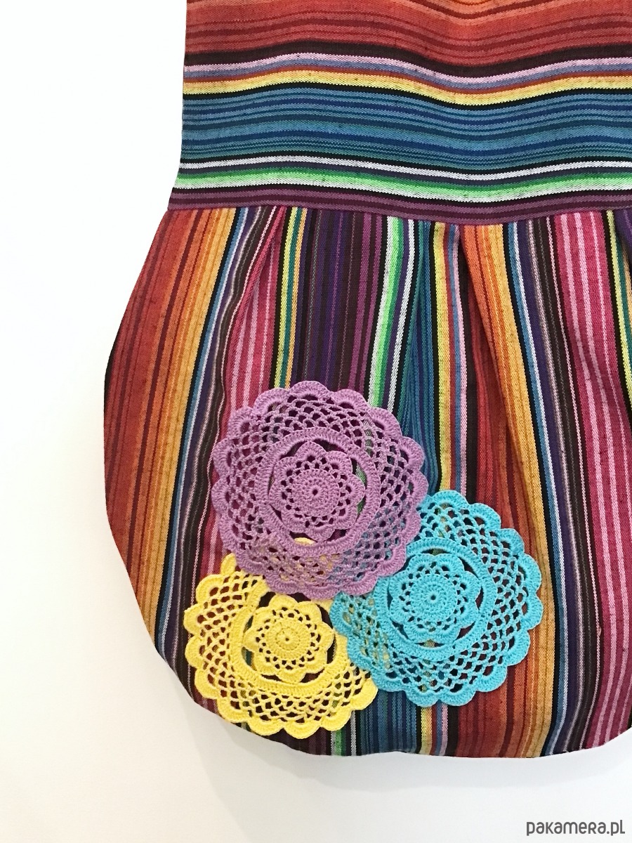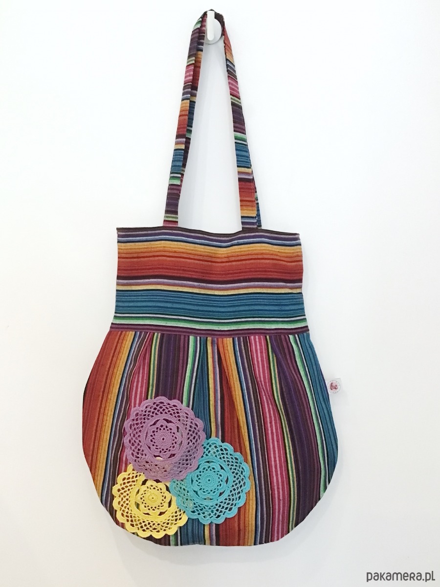 Średniej wielkości torba uszyta w pojedynczym egzemplarzu z bawełny w kolorowe paski. Przód torby został ozdobiony trzema ręcznie haftowanymi aplikacjami. W środku bawełniana podszewka oraz trzy kieszenie (w tym jedna na suwak) i miejsce na przypięcie kluczy. Torba zapinana jest na magnes.