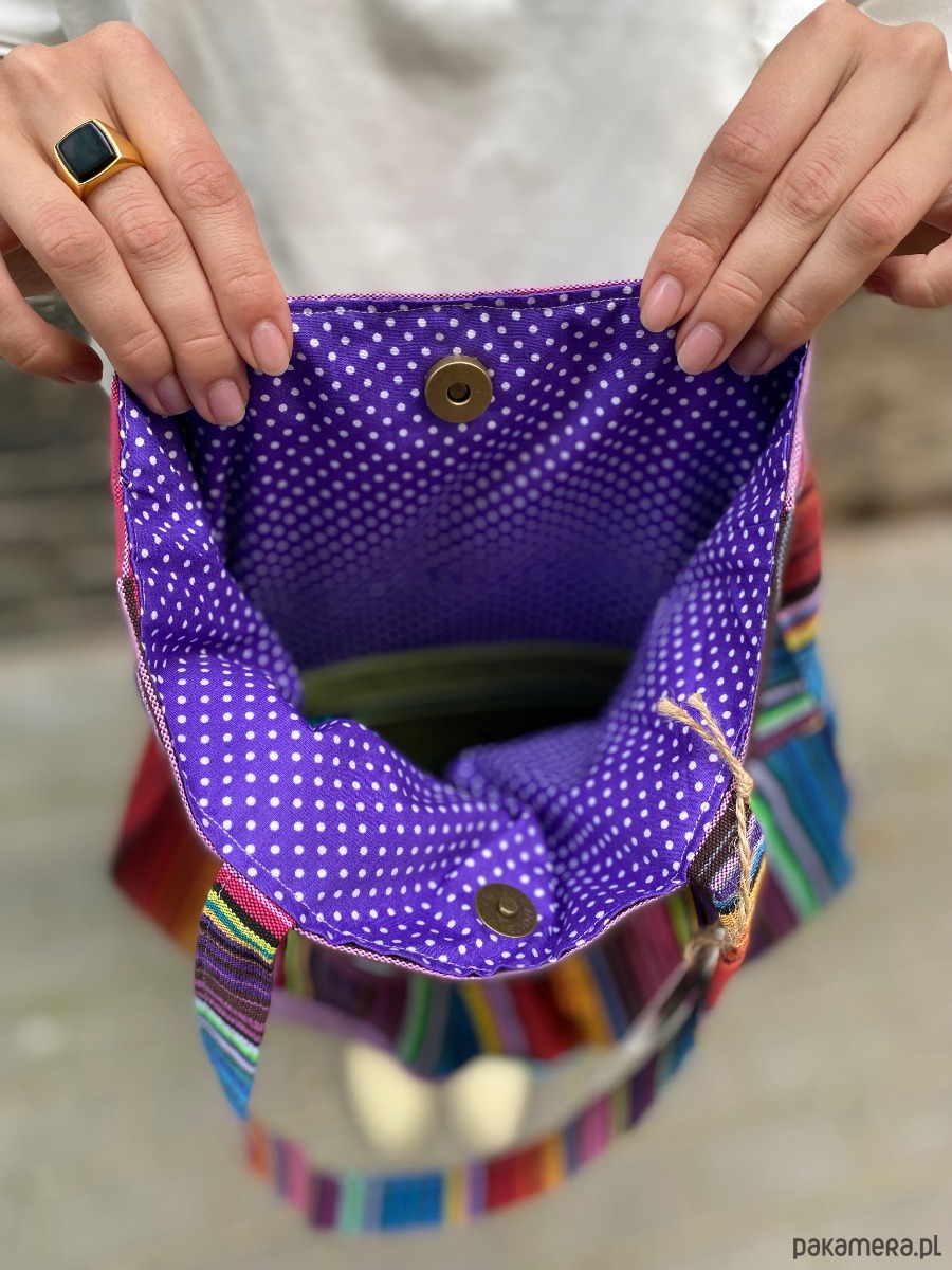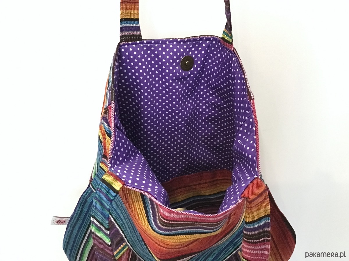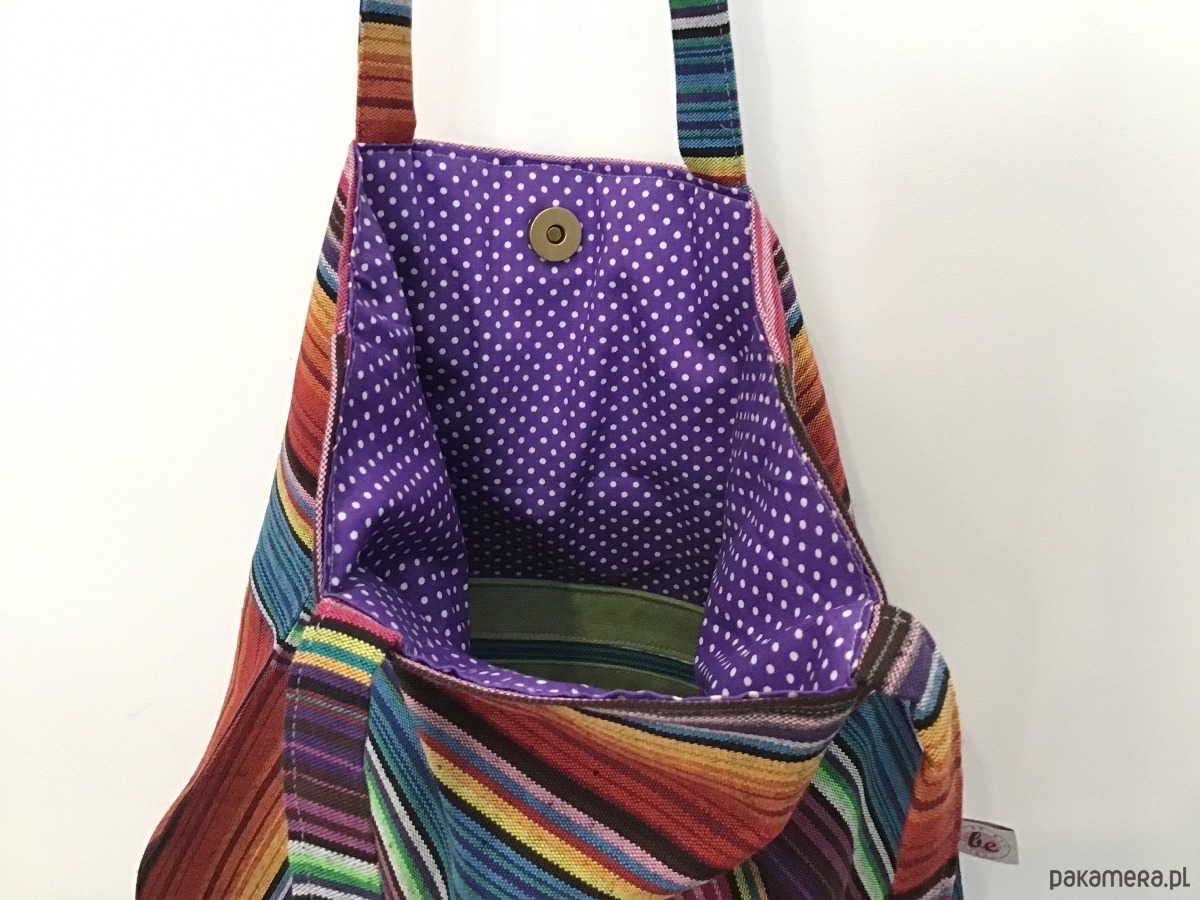 Średniej wielkości torba uszyta w pojedynczym egzemplarzu z bawełny w kolorowe paski. Przód torby został ozdobiony trzema ręcznie haftowanymi aplikacjami. W środku bawełniana podszewka oraz trzy kieszenie (w tym jedna na suwak) i miejsce na przypięcie kluczy. Torba zapinana jest na magnes.