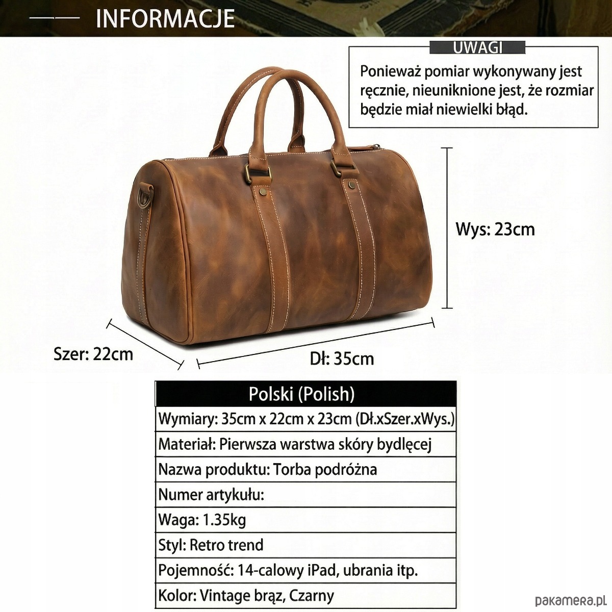 Przemyślana w każdym caluWymiary: 35 cm × 22 cm × 23 cmKompaktowa, a jednocześnie pojemna – idealna w podróż, do pracy, na siłownię czy weekendowy wyjazd.✅Praktyczne rozwiązania ułatwiające życiePrzemyślane przegródki, solidny suwak, wytrzymałe rączki — nic nie dzieje się tu przypadkiem.✅Uniwersalność, która robi różnicęJedna torba na wiele okazji — od biznesowych spotkań po szybki wypad za miasto.✅Trwałość na lataSkóra naturalna + precyzyjne wykonanie = produkt, który będzie Ci służył dłużej, niż zakładasz.