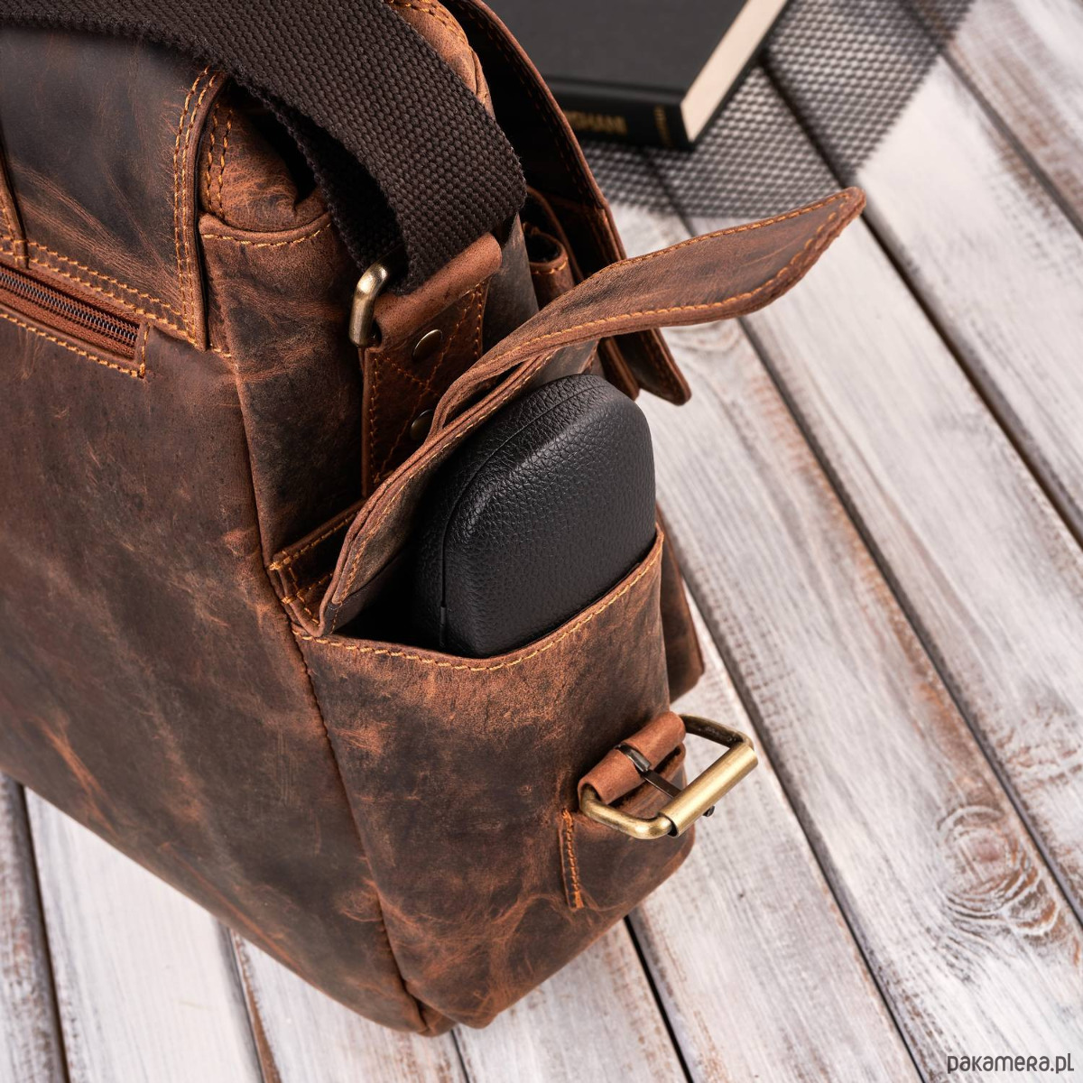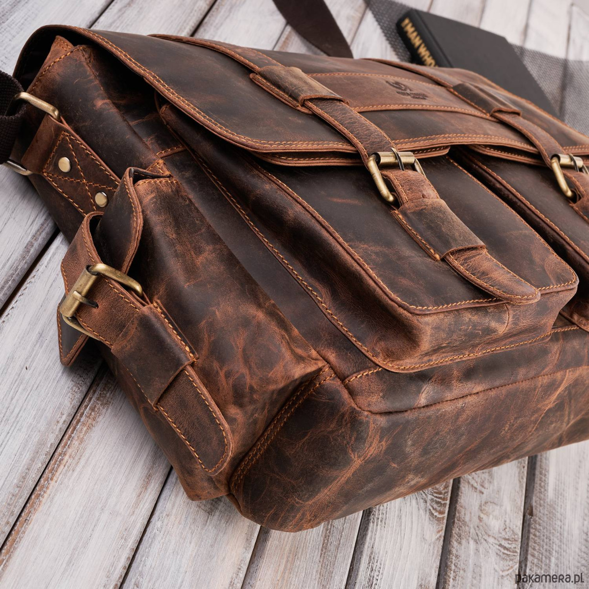 Torba na laptopa T-106 została zaprojektowana z myślą o przechowywaniu akcesoriów biurowych. Wykonana z wysokojakościowej skóry naturalnej, jest wytrzymała i łatwa w czyszczeniu. Ponadczasowy design i prosty fason sprawia, że torba spodoba się każdemu mężczyźnie, niezależnie od wieku. Model T-106 jest zapinany skórzanymi paskami na klamry. Pod klapą umieszczono dwie kieszenie na magnetyczne napy (19 x 15 cm). Komora główna, zapinana na suwak, mieści przegrodę na laptopa (35 x 20 cm), kieszonkę na telefon oraz kieszeń wsuwaną, z przeznaczeniem na portfel lub inne drobiazgi. Dodatkową przestrzeń do przechowywania stanowią kieszeń tylna po długości oraz dwie kieszenie boczne, zapinane na klamry. Torba posiada skórzany naramiennik i regulowany pasek 95 – 150 cm.