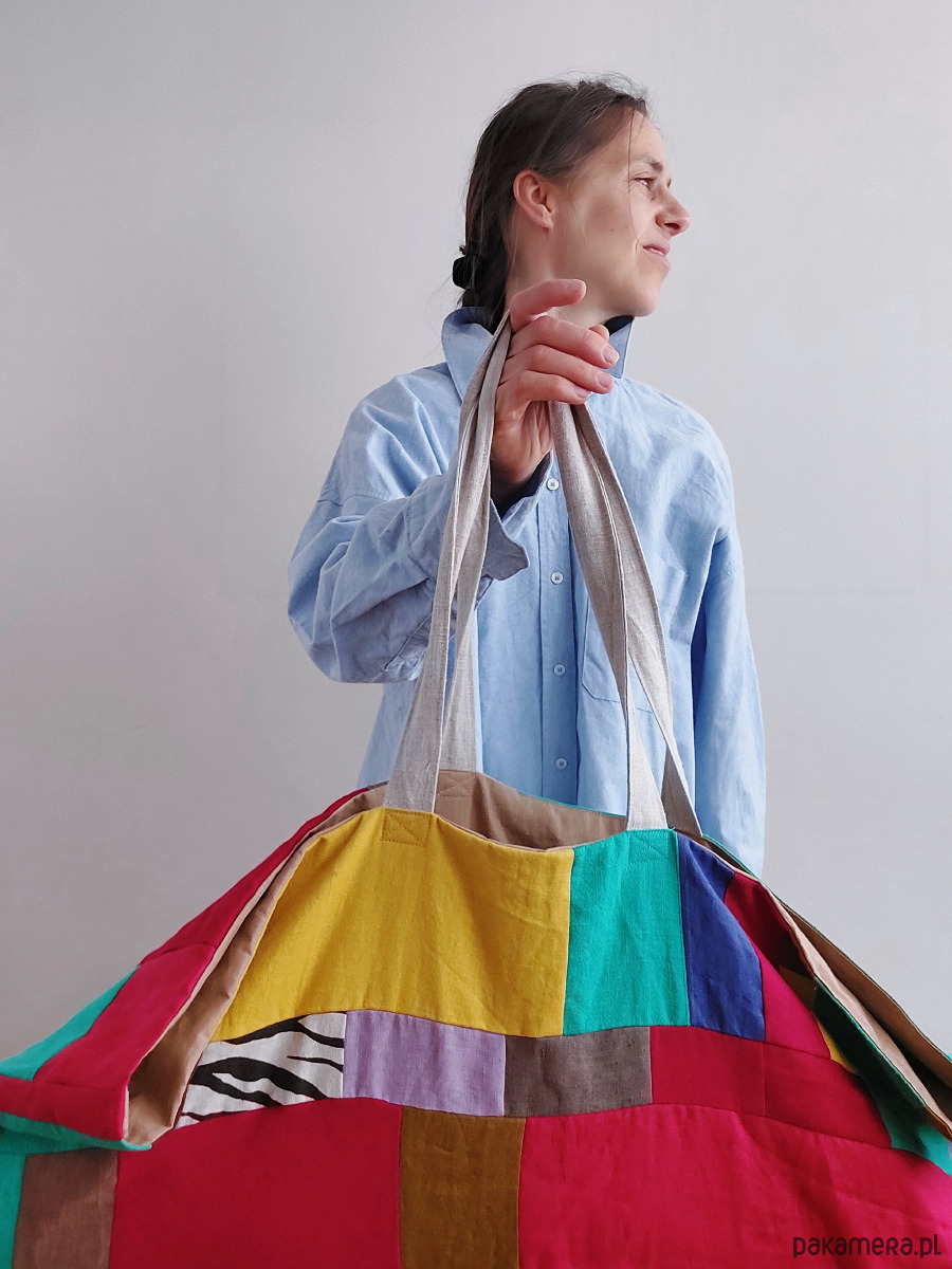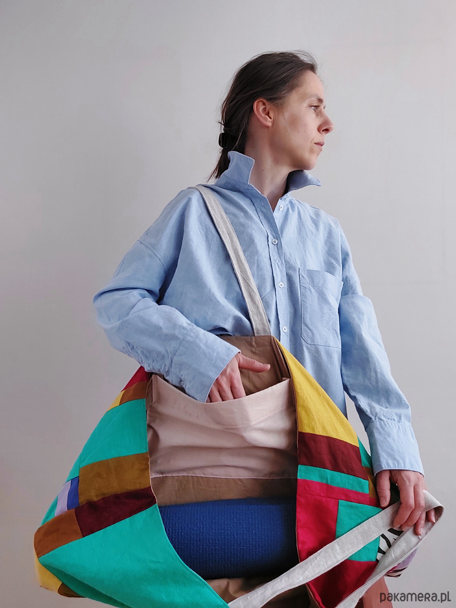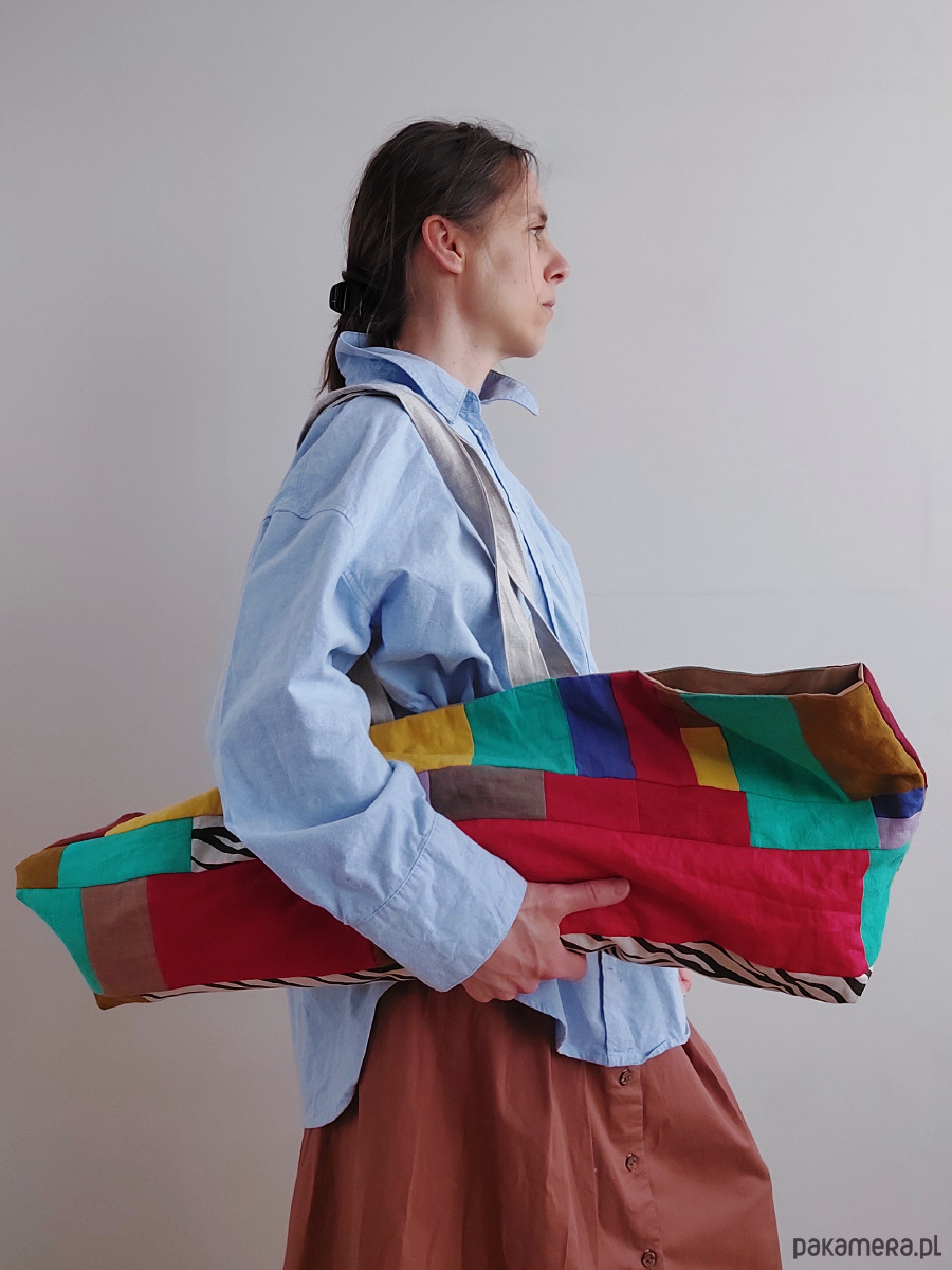 Cudownie wygodna torba na jogę/miasto/plażę, uszyta w polskiej szwalni madebyjokpa w duchu ZERO WASTE (bezstratnie). Patchwork z małych kawałków 100% lnu, wnętrze wykonane z bawełny 100%, torba ma dwie wewnętrzne kieszenie np. na telefon, klucze itd.