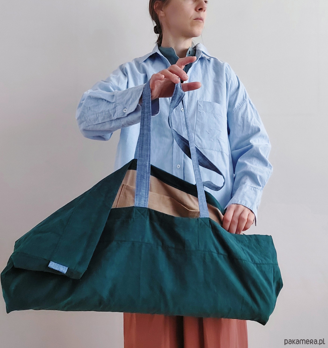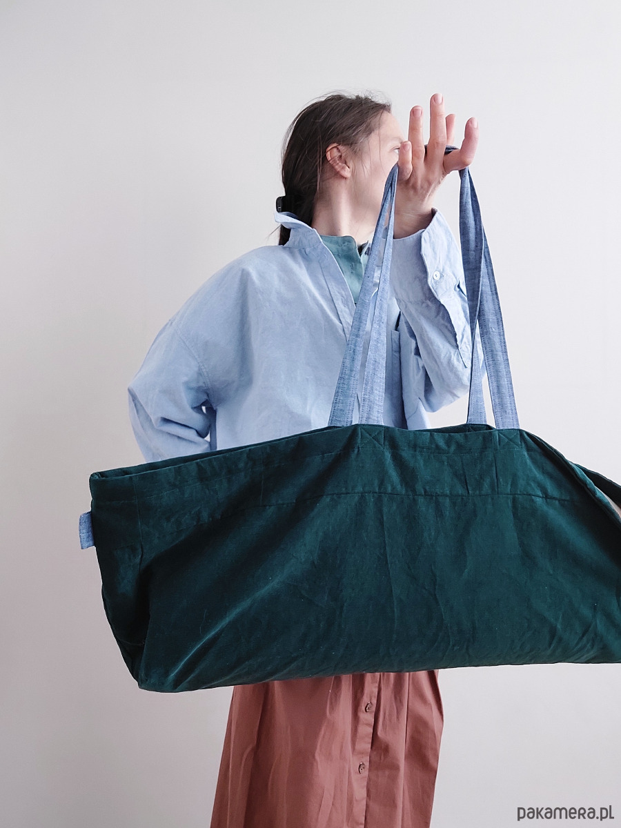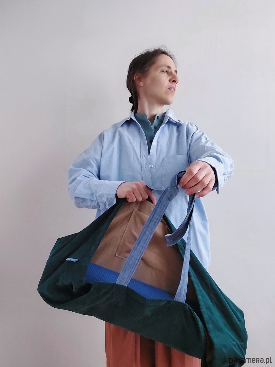 Cudownie wygodna torba na jogę, uszyta w polskiej szwalni madebyjokpa w duchu ZERO WASTE (bezstratnie). Patchwork z kawałków zielonego jak leśny mech sztruksu plus lniane błękitne paski nośne. Wnętrze wykonane z bawełny 100% ,torba ma wewnętrzną kieszeń np. na telefon i klucze.