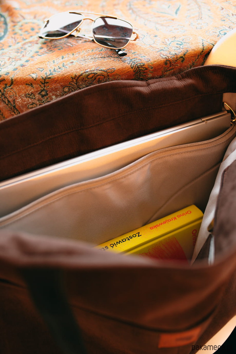 Duża, brązowa nubukowa torba z kieszenią na laptop.