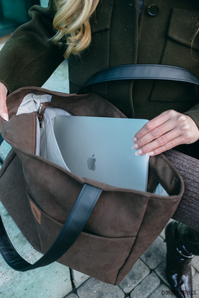 Duża, brązowa nubukowa torba z kieszenią na laptop.