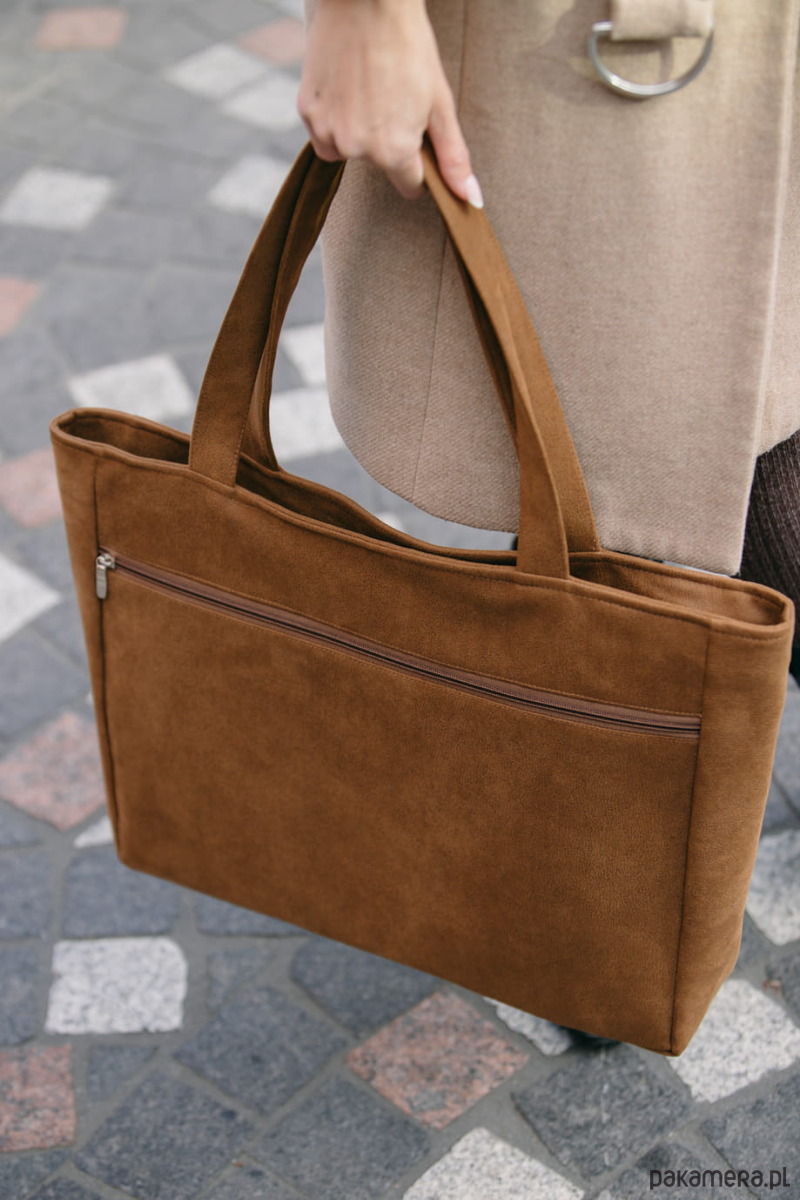 Duża brązowa nubukowa torba z kieszenią na laptop.
