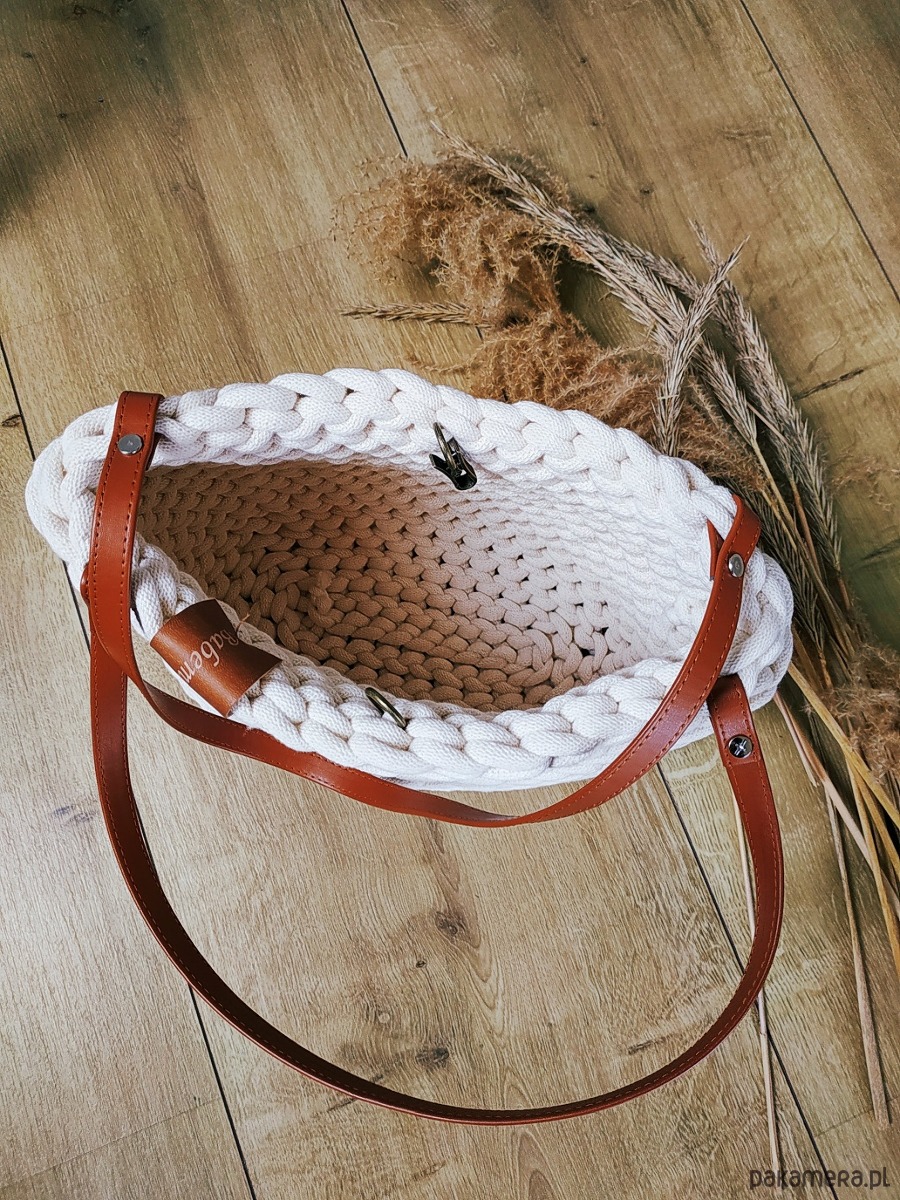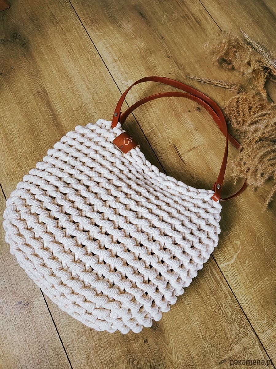 Duża torba wykonana na szydełku przepięknym luźnym splotem. Wykonana jest z grubego, mięsistego aczkolwiek lekkiego sznurka. torba jest miękka i miła w dotyku.