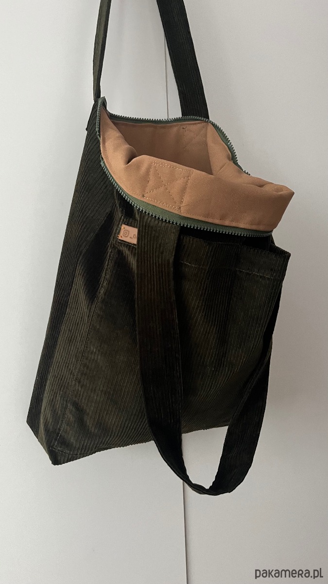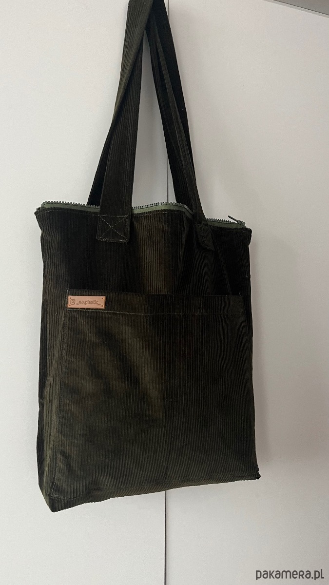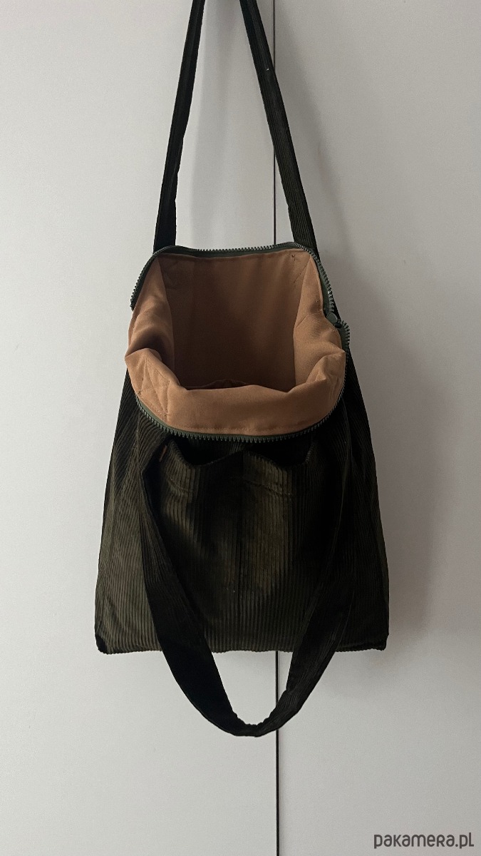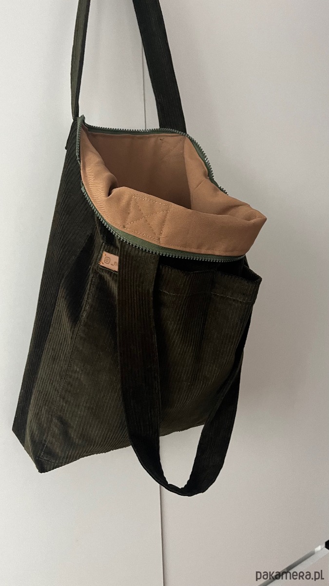 Torba wykonana jest e sztruksui zapinana jest na zamek błyskawiczny. Posiada kieszenie wewnętrzne i zewnętrzne. Rozmiar 38 na 41
