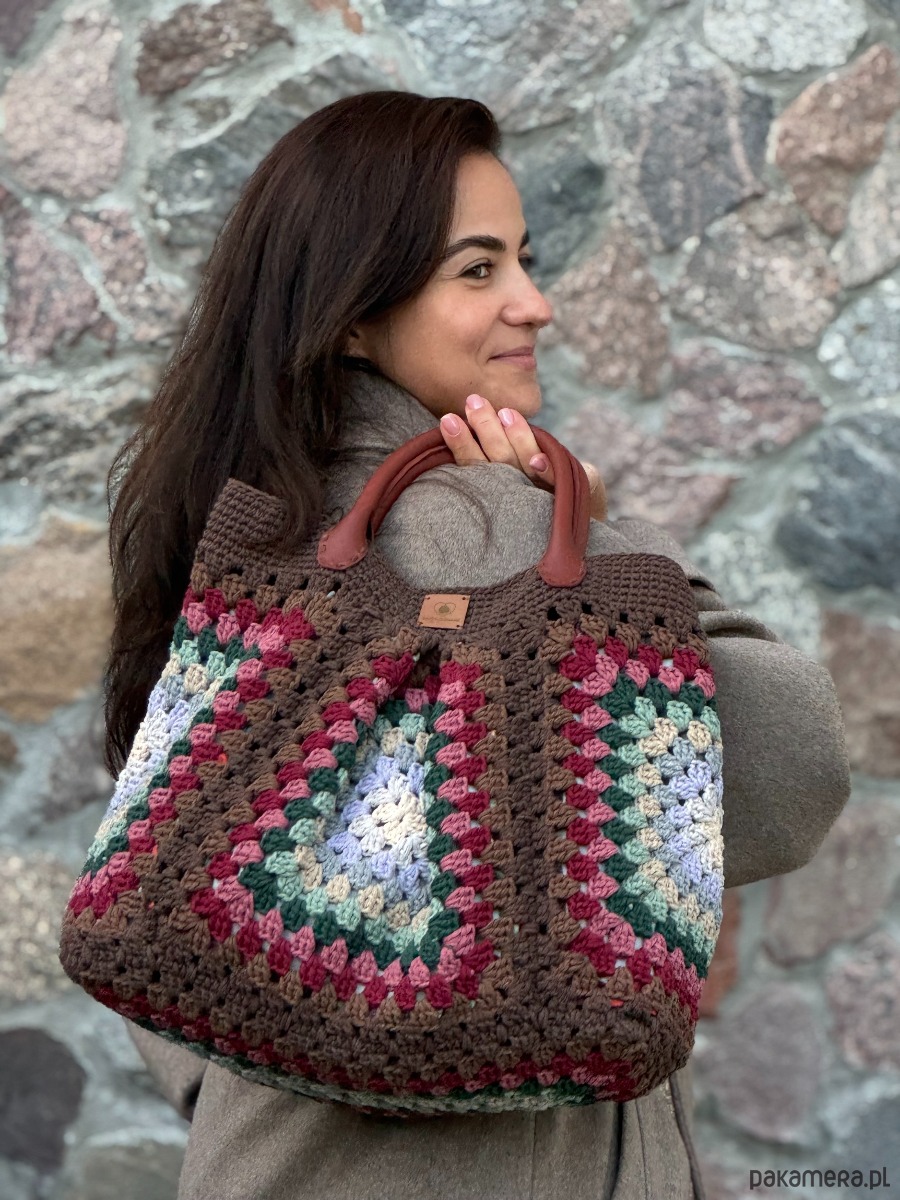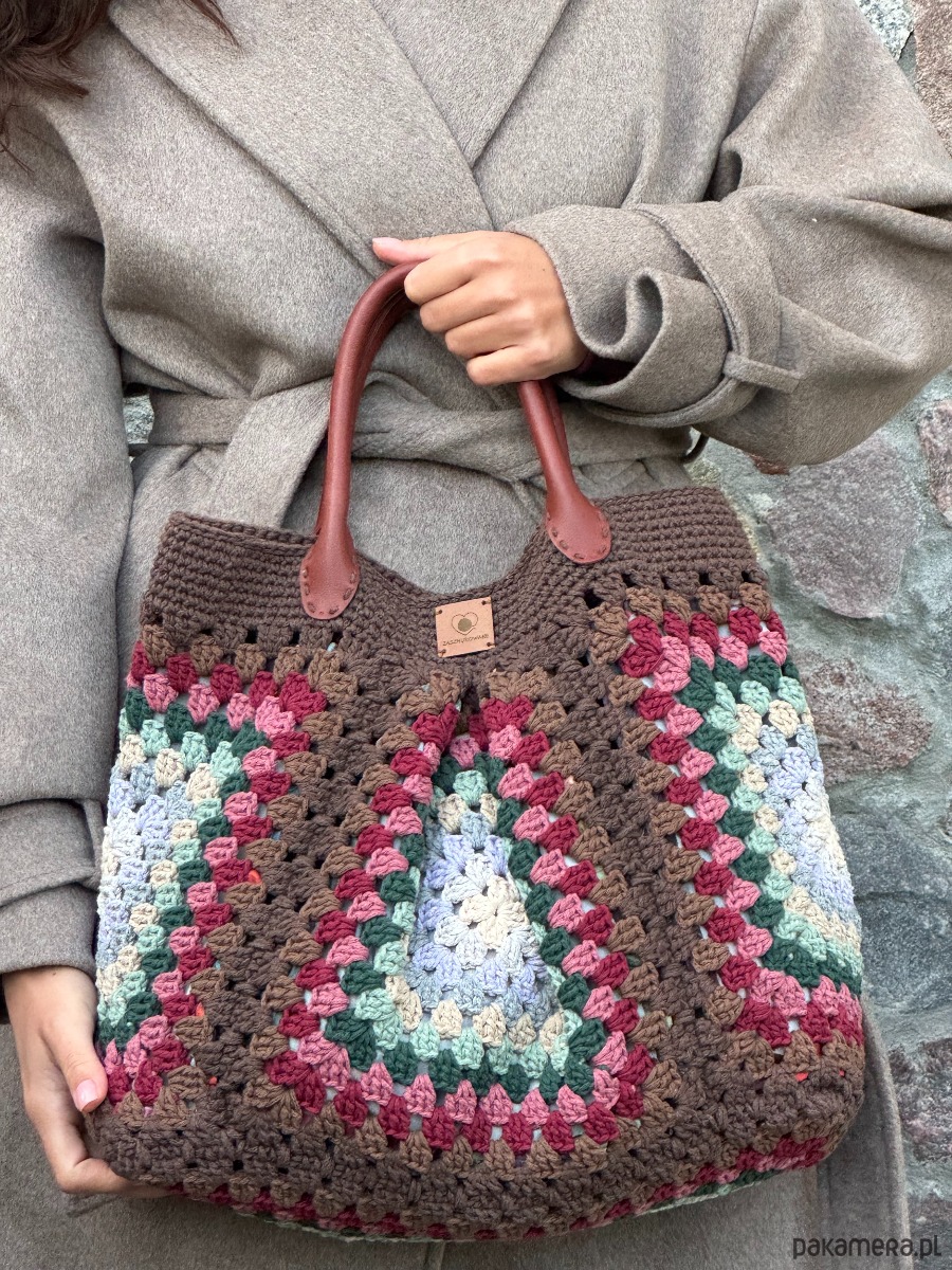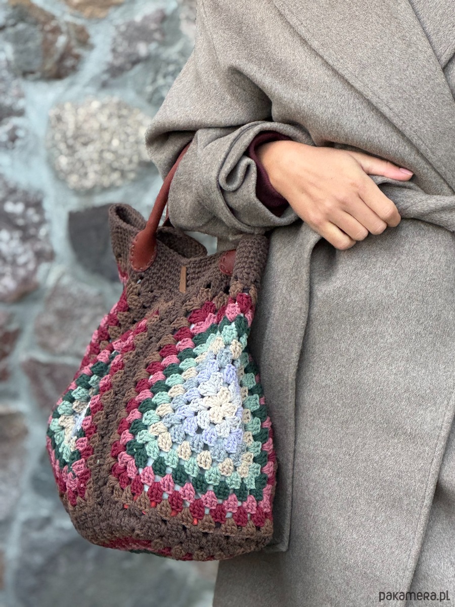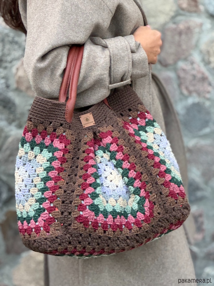 Torebka jest miękka, ale dzięki usztywnianemu dnu zachowuje formę i pomieści wszystkie niezbędne rzeczy. Kolorowa kompozycja granny square nadaje jej unikatowy charakter i sprawia, że każda sztuka jest niepowtarzalna.