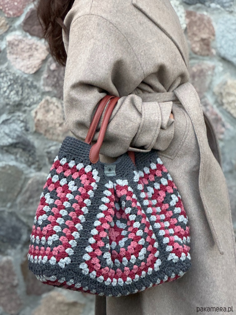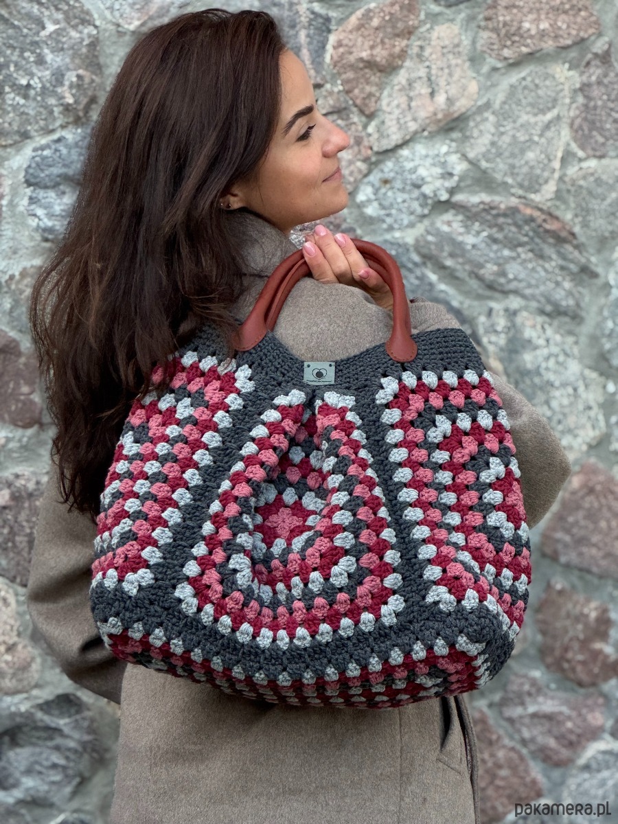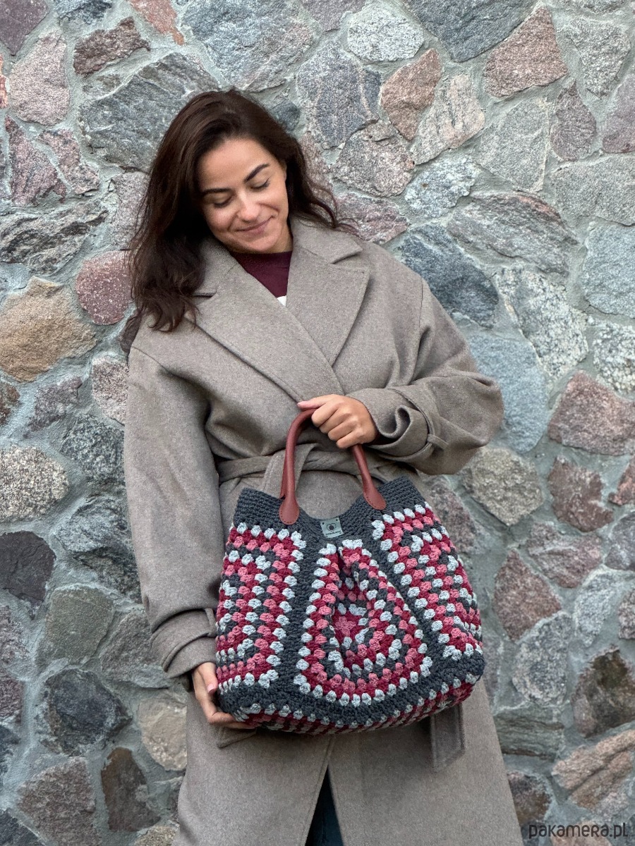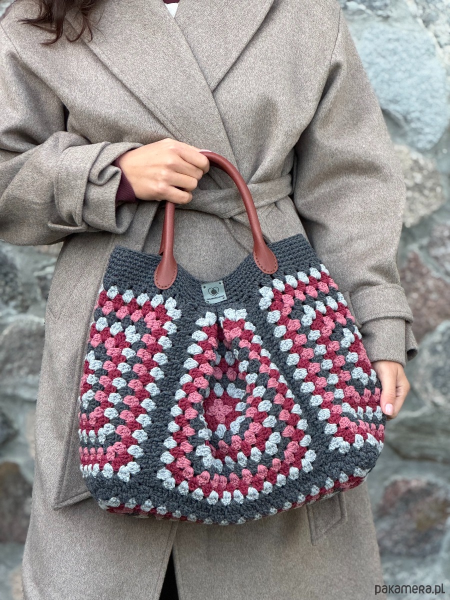 Torebka jest miękka, ale dzięki usztywnianemu dnu zachowuje formę i pomieści wszystkie niezbędne rzeczy. Kolorowa kompozycja granny square nadaje jej unikatowy charakter i sprawia, że każda sztuka jest niepowtarzalna.