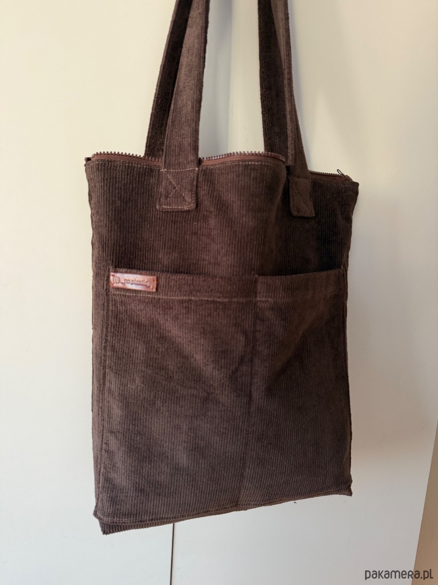 Torba uszyta z sztruksu, zapinana na zamek. Posiada kieszenie wewnętrzne i zewnętrzne. Rozmiar 38 na 41 cm