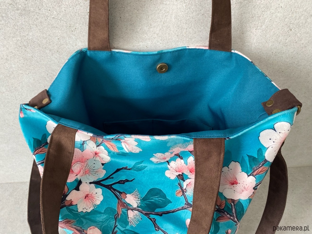 W środku wykończona podszewką, z dwudzielną kieszonką.