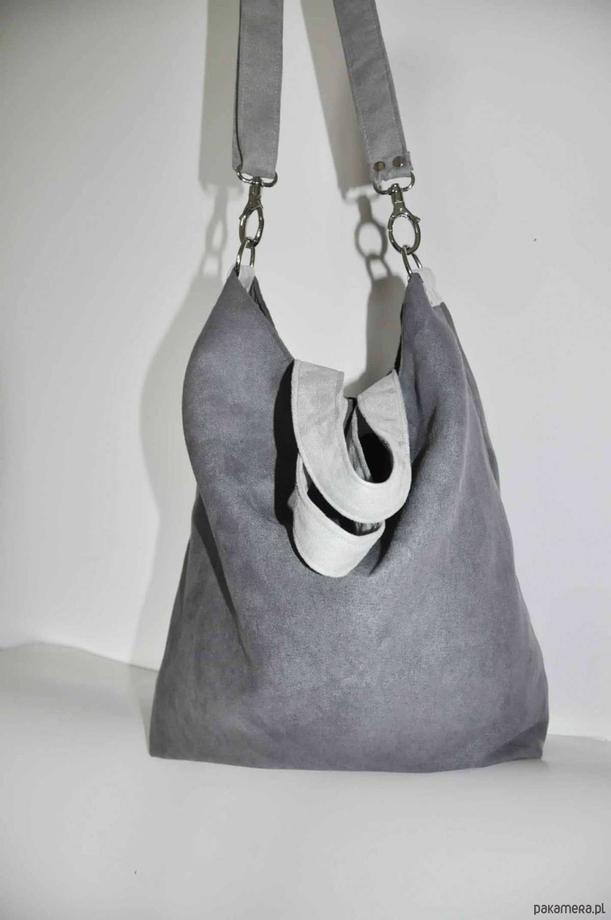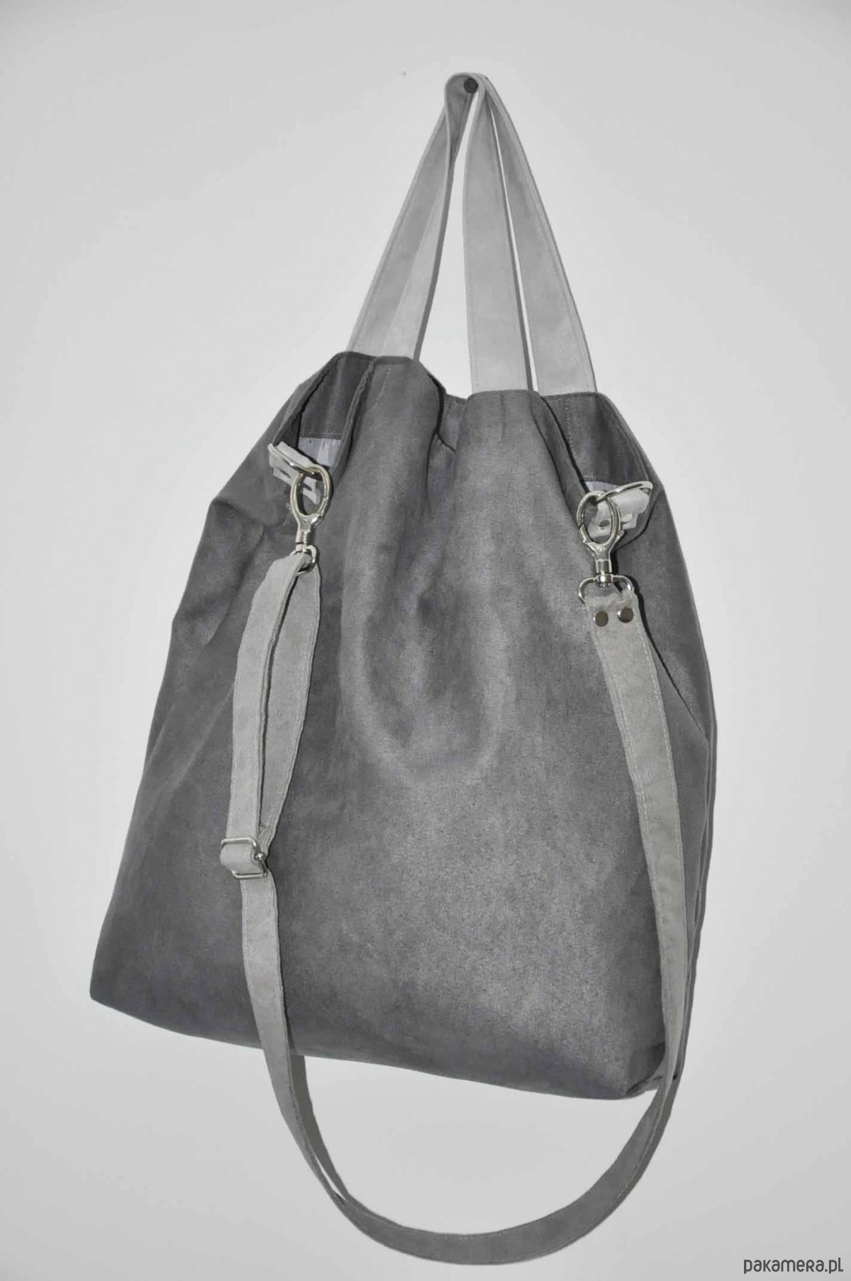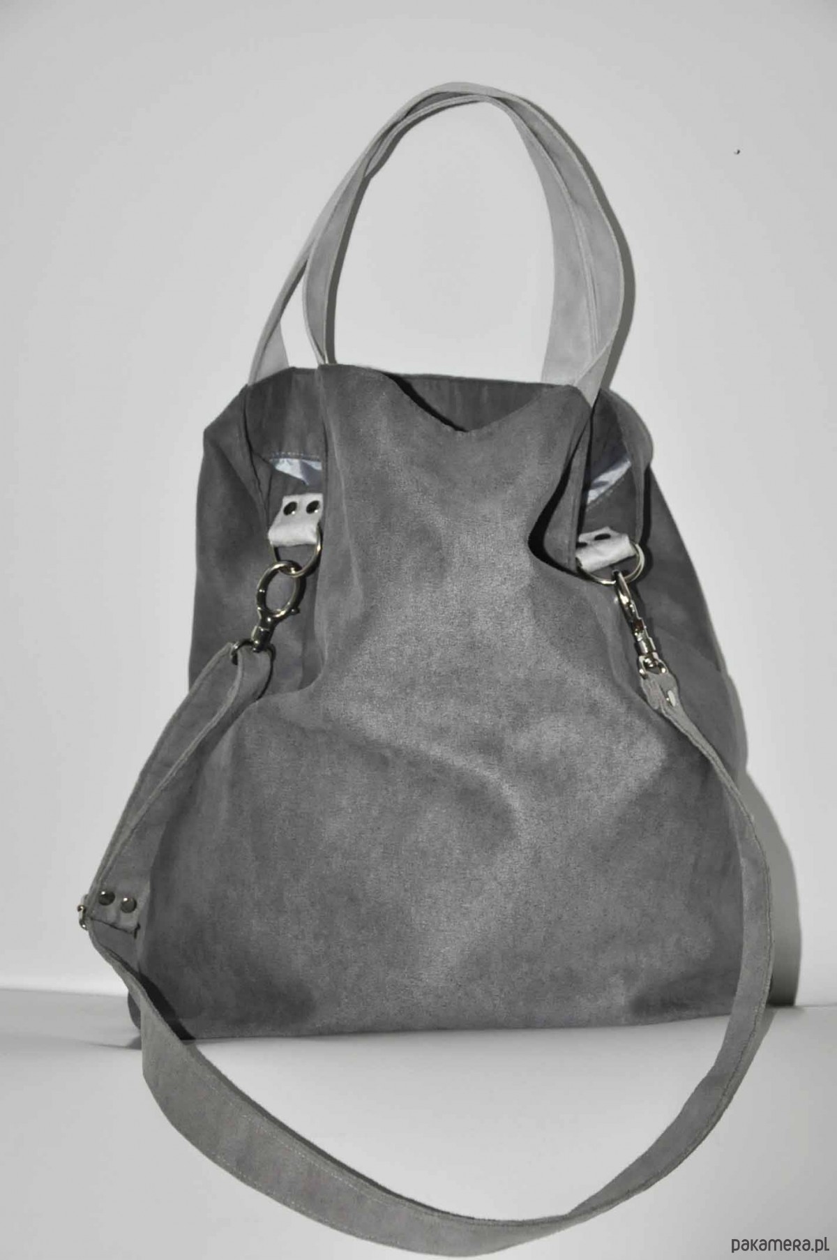 Przepastna torba wykonana z alcantry (syntetycznego zamszu).