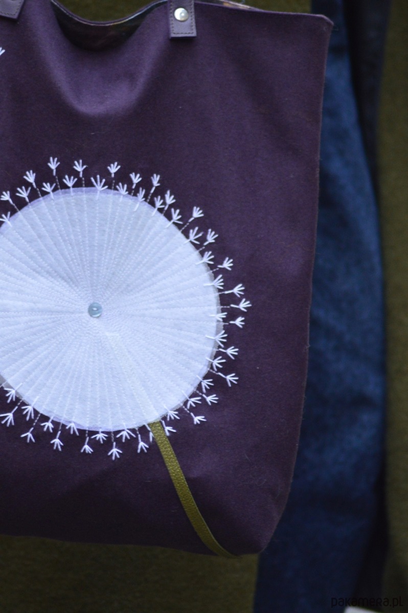 Torba na zakupy wykonana z tkaniny wełnianej ,flauszowej , lnianej podszewki oraz skóry naturalnej w pięknym śliwkowym kolorze. Aplikacja na torbie została wyszyta z tkaniny i skóry. Wewnątrz znajduje się kieszonka na suwak. Idealna na codzienne zakupy ;)