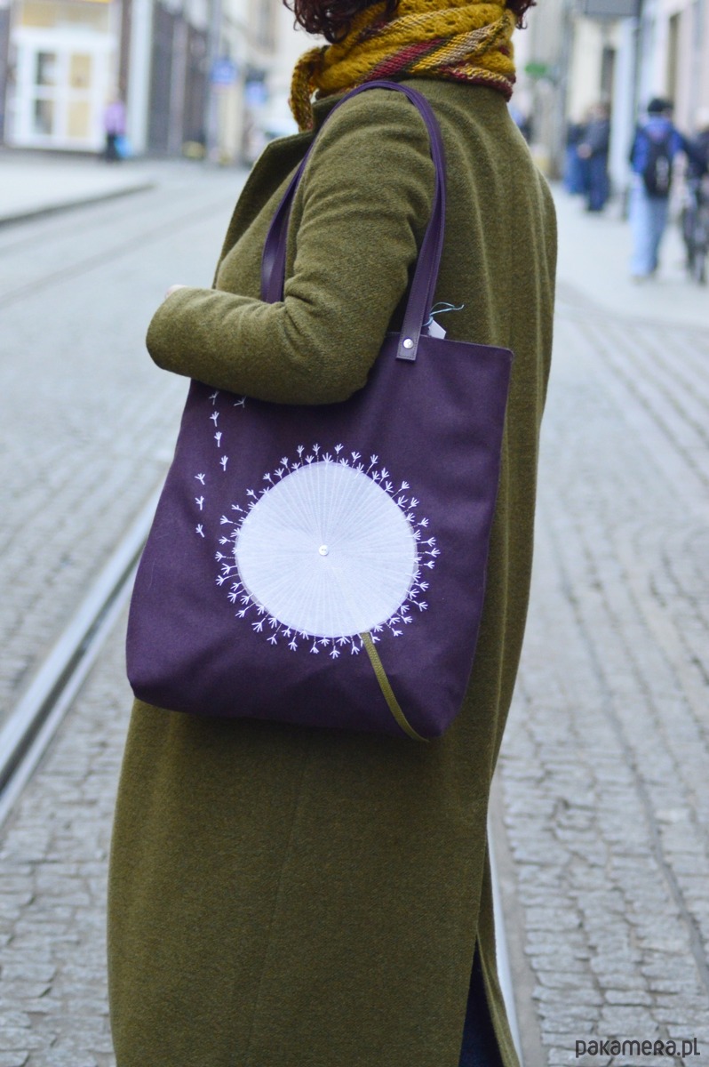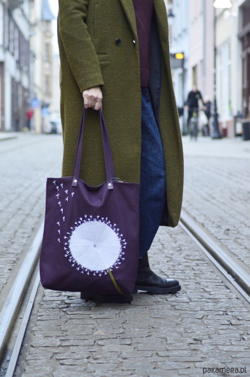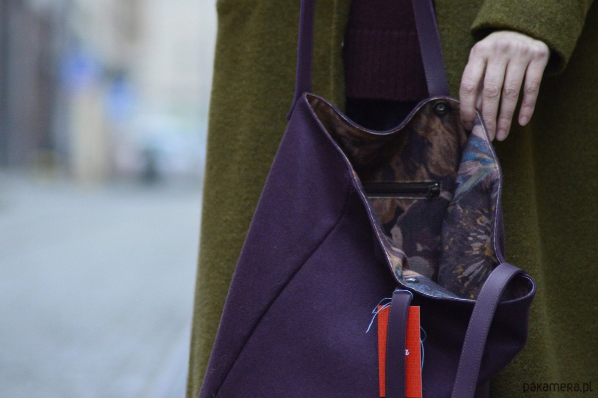 Torba na zakupy wykonana z tkaniny wełnianej ,flauszowej , lnianej podszewki oraz skóry naturalnej w pięknym śliwkowym kolorze. Aplikacja na torbie została wyszyta z tkaniny i skóry. Wewnątrz znajduje się kieszonka na suwak. Idealna na codzienne zakupy ;)