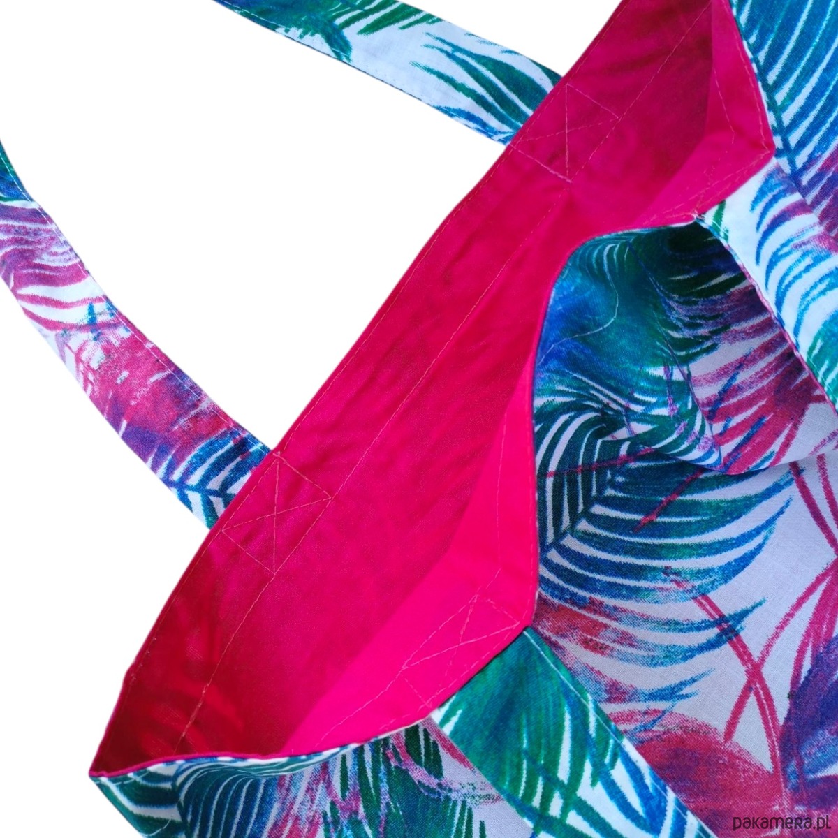Ekologiczna torba na zakupy uszyta z bawełny 100% z nadrukowanym motywem i bawełnianą różową podszewką.