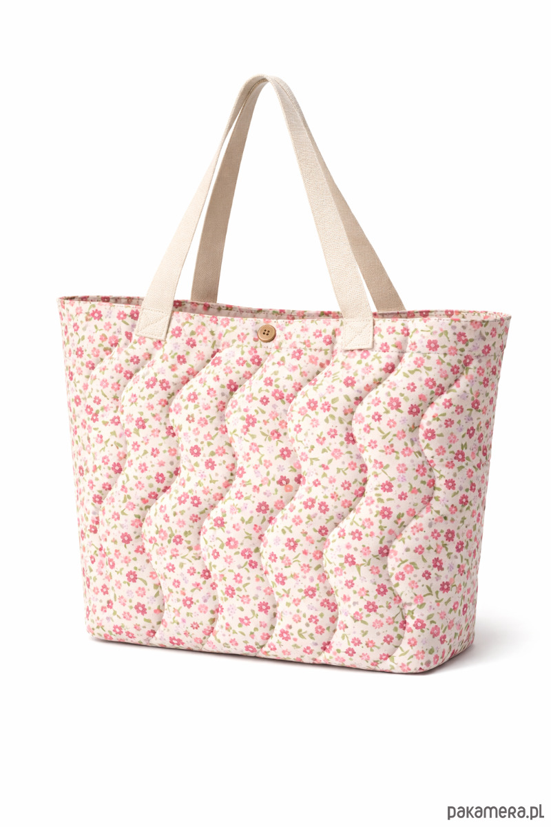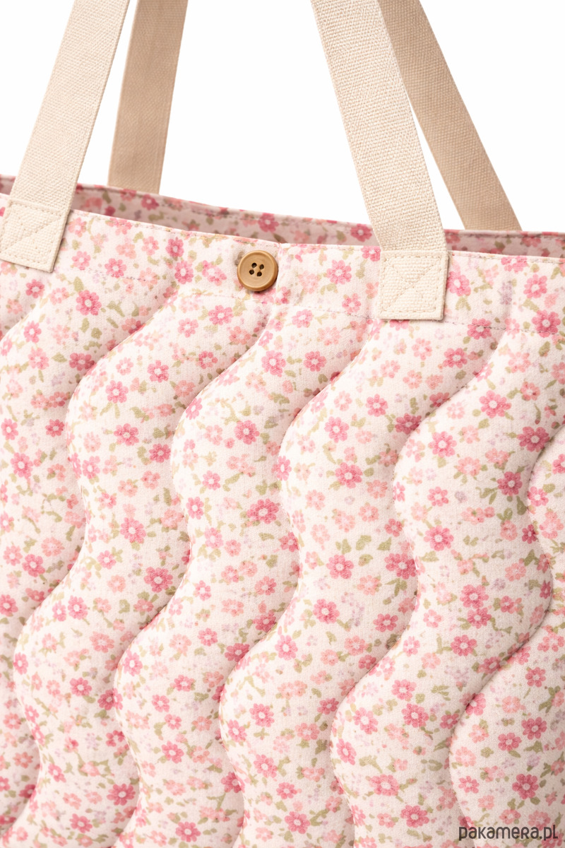 Torebka jest dwustronnie pikowana, co tworzy charakterystyczne, falowane przeszycia i nadaje jej miękką, przyjemną strukturę. Wypełnienie stanowią włókna poliestrowe, dzięki czemu zachowuje formę, pozostając jednocześnie miękka i komfortowa w użytkowaniu.