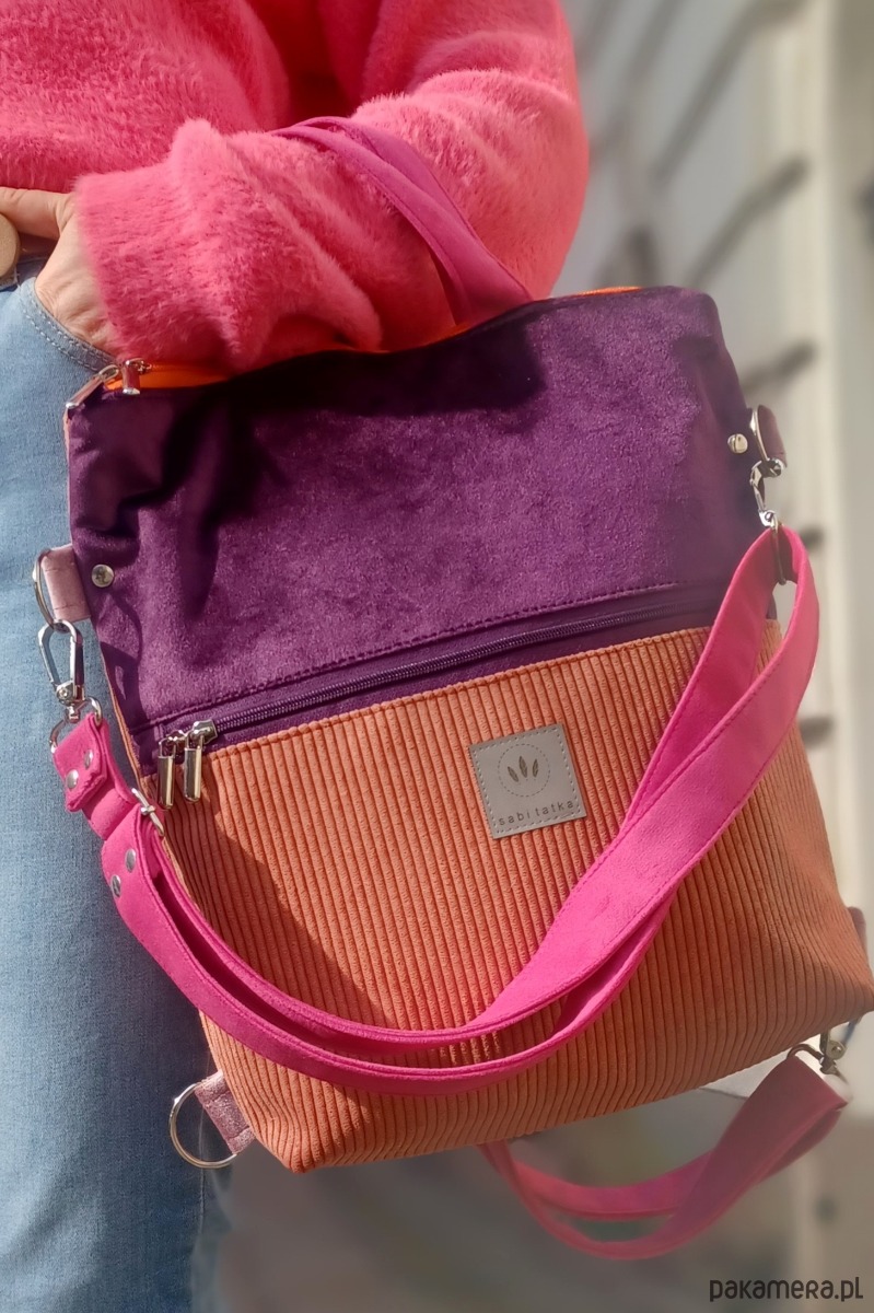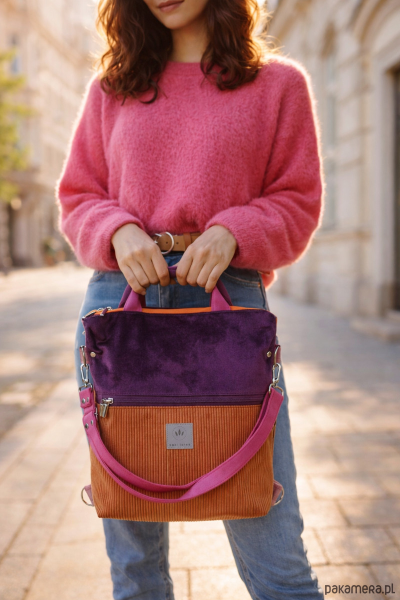 Torebko-plecak może służyć jako torebka albo jak plecak po przypięciu szelek do tyłu plecaka.