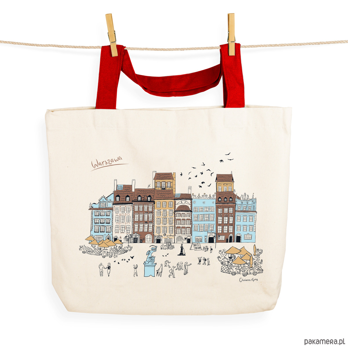 Rynek Starego Miasta w Warszawie – strona Dekerta. Mocne i pojemne torby wykonane są z grubego płótna. Torba ma rączki w czerwonym kolorze i praktyczną kieszonkę w środku. Trwały nadruk dla wielbicieli Warszawy. Każda torba pakowana jest indywidualnie, po złożeniu zajmuje niewiele miejsca. Jest idealna na duże zakupy albo na wycieczkę po mieście.