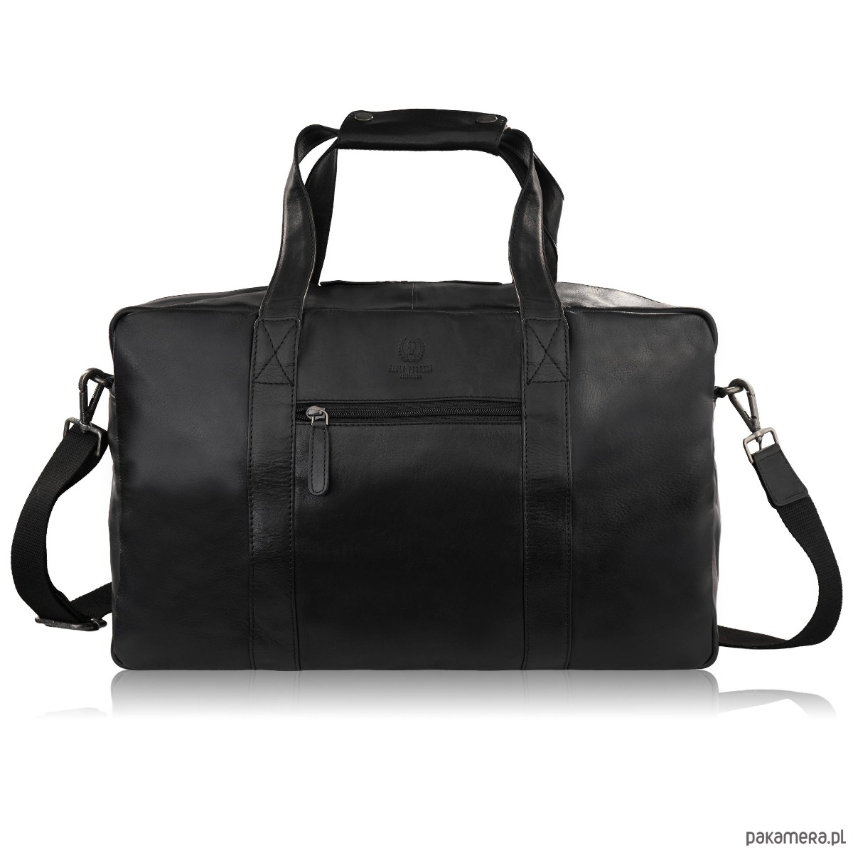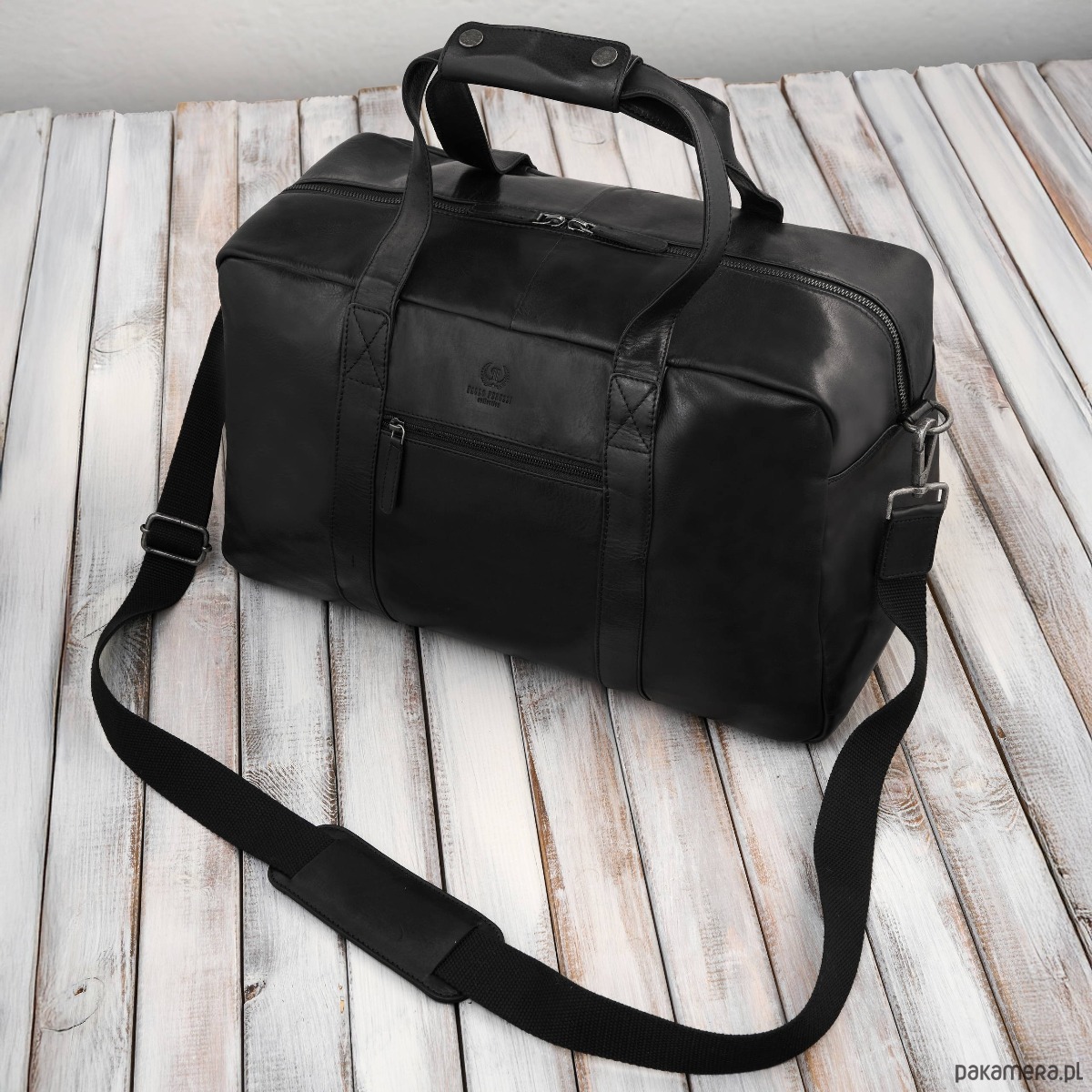 Ta skórzana torba podróżna została wykonana z wyselekcjonowanej skóry naturalnej, która z czasem nabiera jeszcze szlachetniejszego charakteru. Kolor czarny w połączeniu ze srebrnymi okuciami podkreśla prestiż i elegancję, czyniąc torbę idealnym wyborem zarówno jako torba podróżna męska, jak i stylowy bagaż weekendowy.