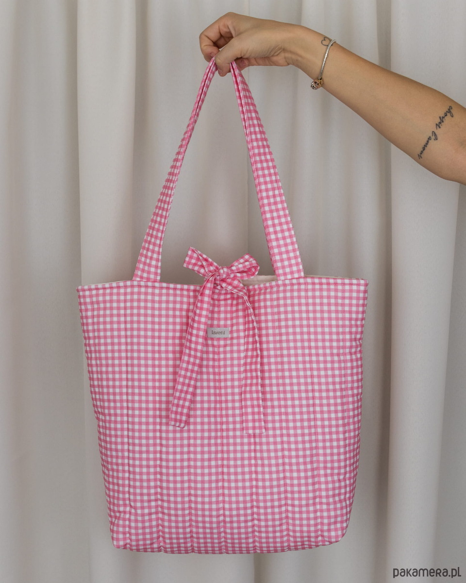 Słodka, ale nie przesłodzona. Torebka tote Pink Sugar przyciąga wzrok swoją różową kratką i dziewczęcą lekkością – to propozycja dla kobiet, które chcą dodać koloru codziennym stylizacjom, ale w eleganckim, subtelnym wydaniu. Każda torebka szyta jest lokalnie z bawełny premium i wykańczana kremową podszewką z naturalnych włókien. Delikatne usztywnienie i ręczne pikowanie sprawiają, że zachowuje kształt, ale pozostaje miękka i lekka.