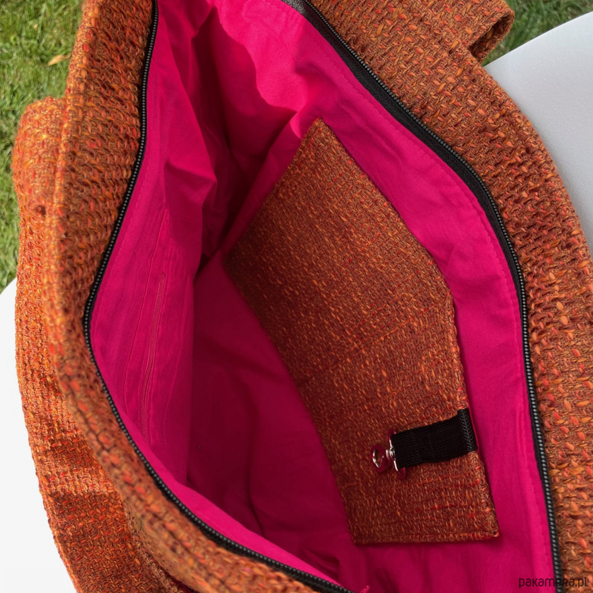 Wewnątrz torba posiada podszewkę i otwartą kieszeń na drobiazgi.