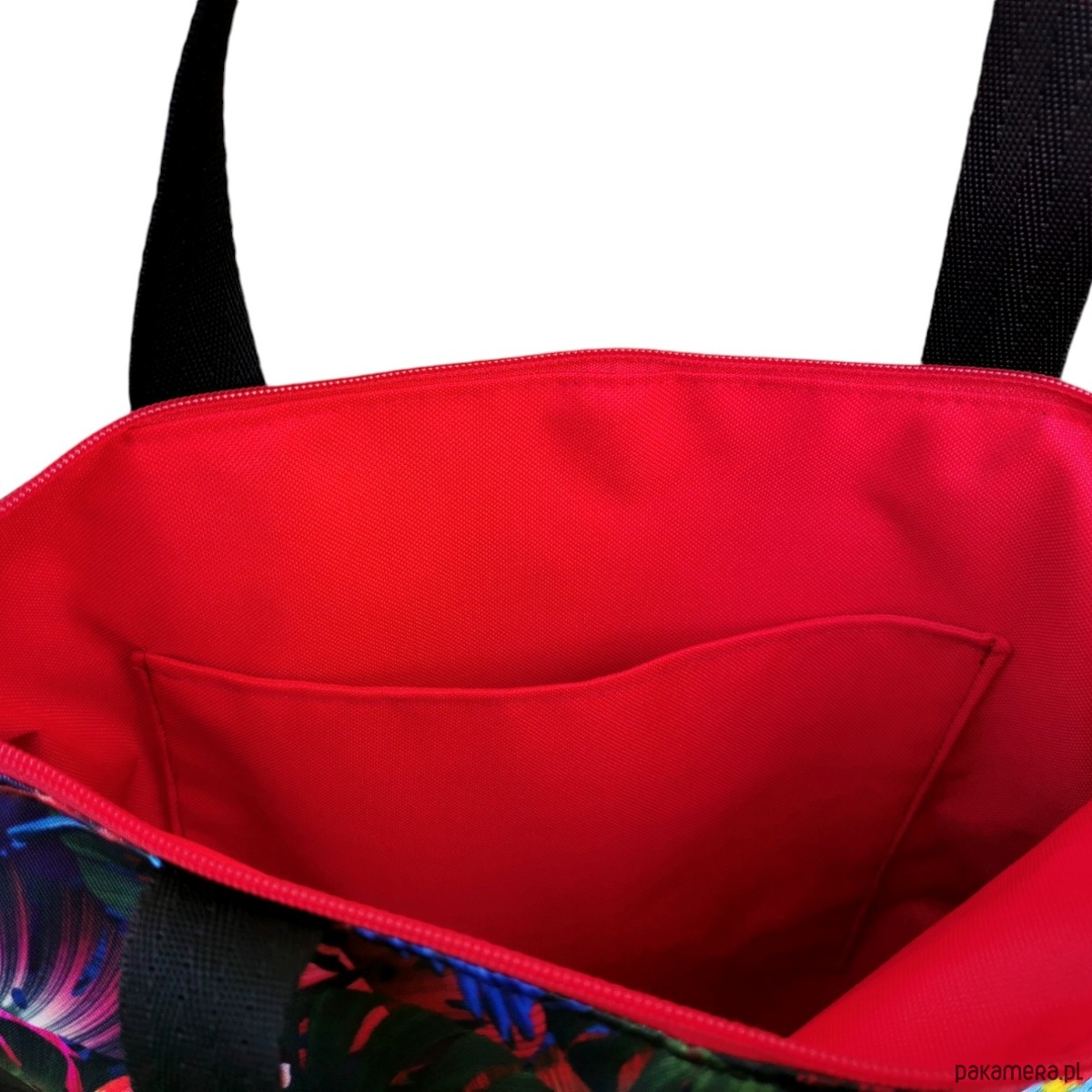 Torba uszyta z wysokiej jakości materiału wodoodpornego z nadrukiem. W środku wodoodporna czerwona podszewka i kieszonka. Dzięki zastosowaniu materiału wodoodpornego, torba jest łatwa w utrzymaniu czystości. Torba zamykana na zamek z ozdobnym suwakiem.