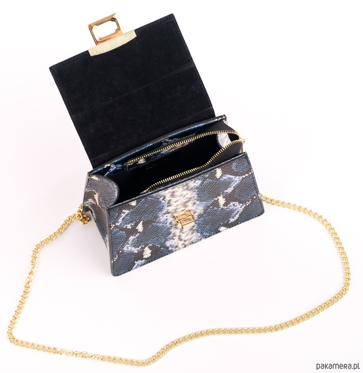 Ozdobne zamknięcie, dopinany łańcuszek do przewieszenia torebki przez ramię.